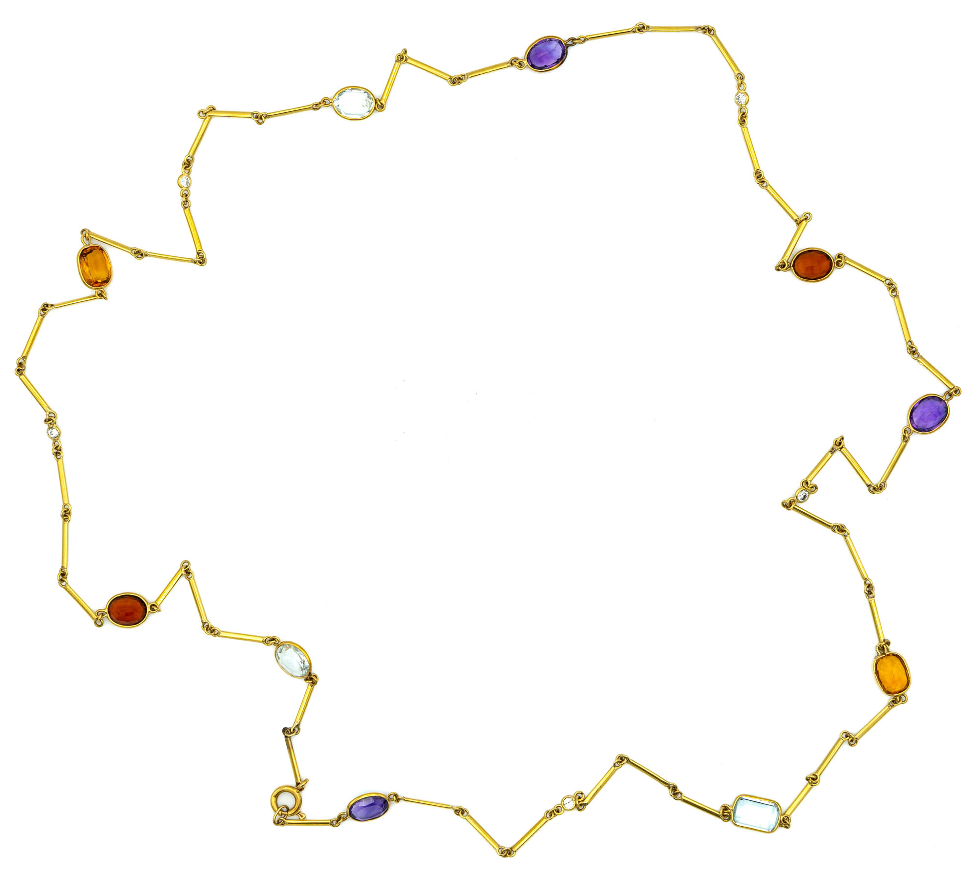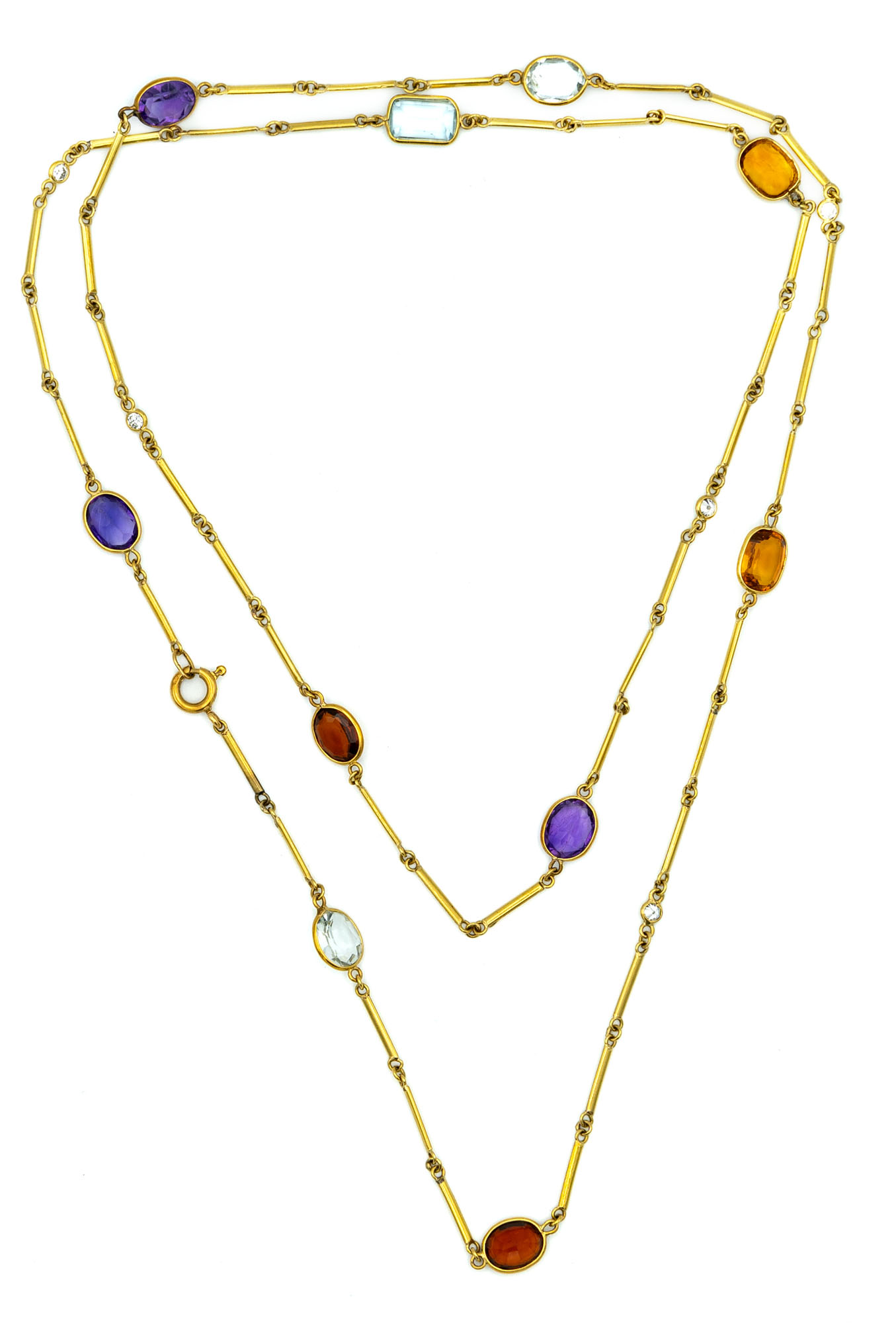 Lunga collana in oro giallo 18ktCon catena a barrette piatte intervallate da pietre di colore di vario taglioPeso totale gr 17Lunghezza 84 cm