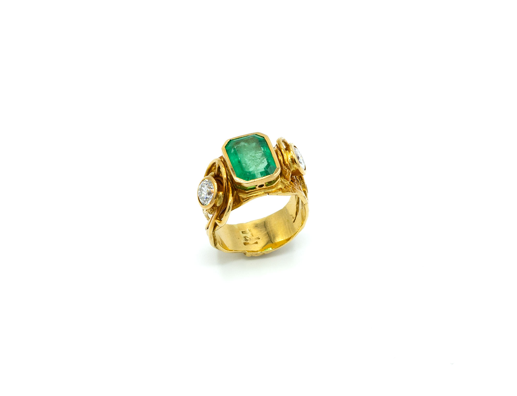 Anello in oro giallo 18ktCon uno smeraldo taglio smeraldo di ct 2.00 circa e due diamanti taglio brillante per un totale di ct 1.00 circaPeso totale gr 5 circaMisura 15