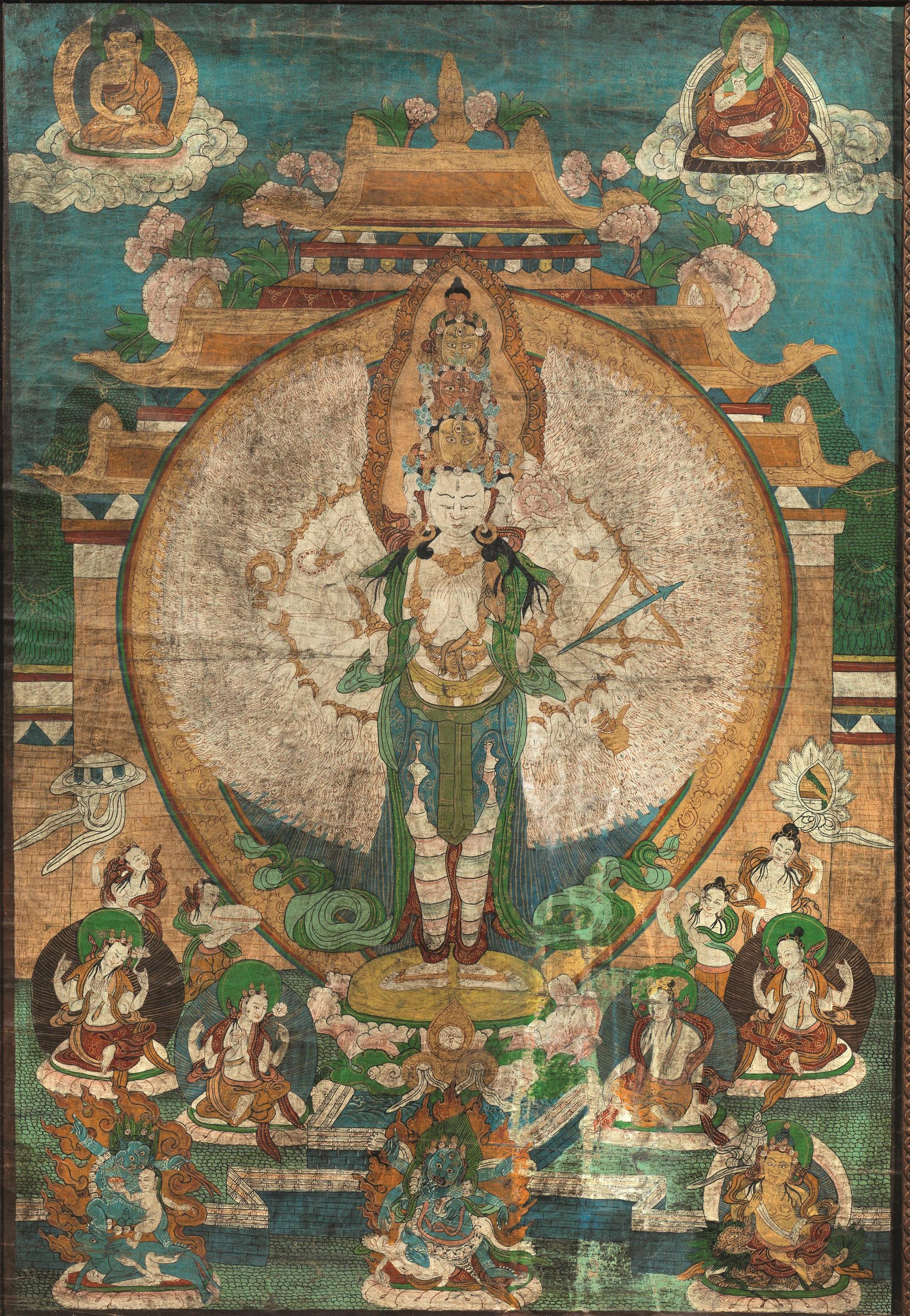 dipinto su tela raffigurante divinità a più mani, Avalokitsevara, cm 58x40,5