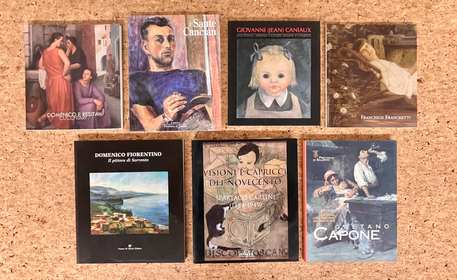 Lotto unico di 8 cataloghi riccamente illustrati relativi a esposizioni personali dei seguenti artisti: Giovanni (Jean) Caniaux, Francesco Franchetti, Sante Cancian, Gaetano Capone, Spartaco Carlini, Umberto Bartoli, Domenico e Resita Cucchiari e Domenico Fiorentino