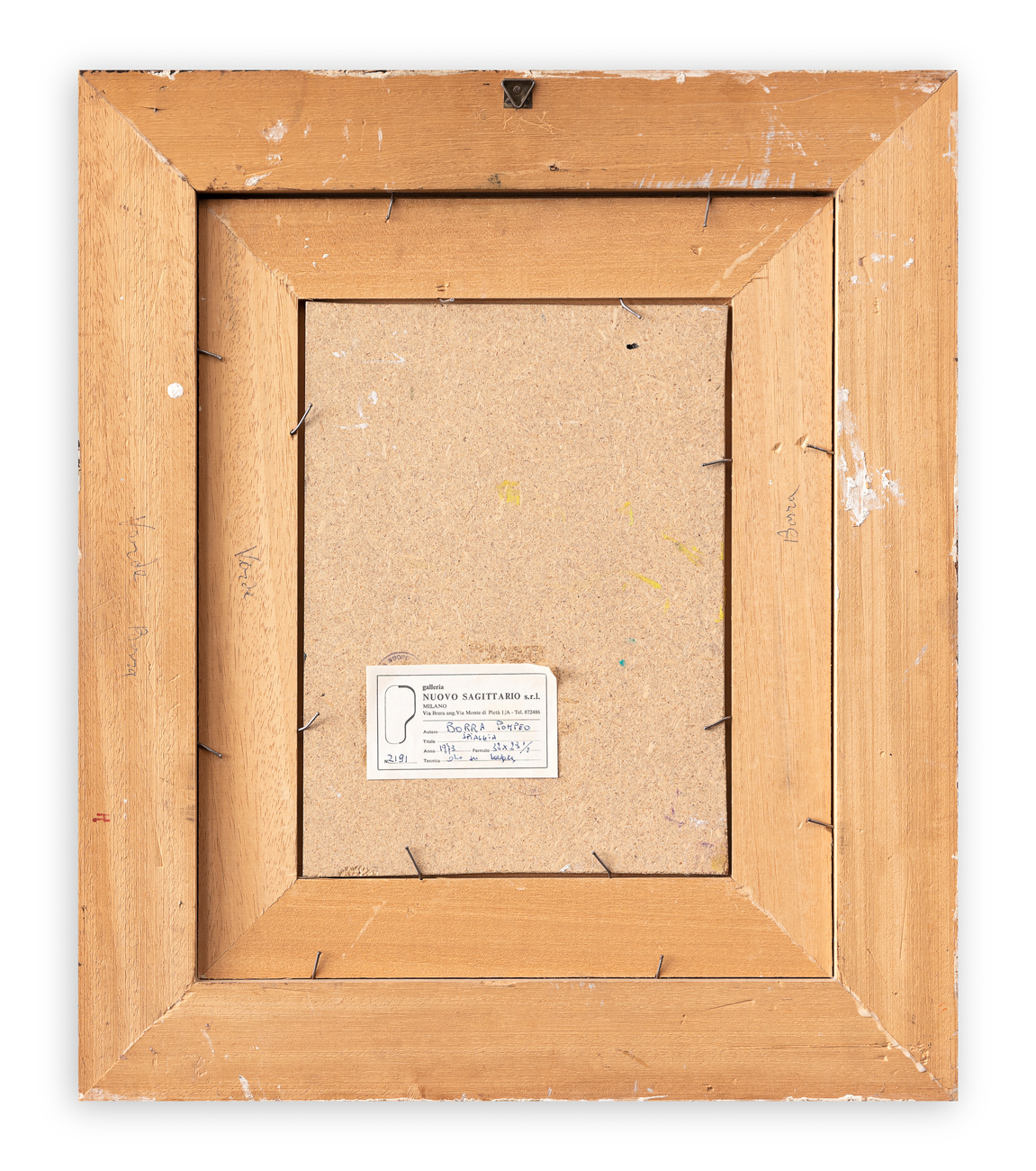 Etichetta e timbri della Galleria Nuovo Sagittario (MI) al retro