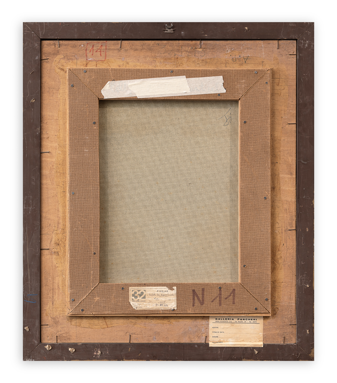 Etichetta della Galleria d'Arte 32 (MI), con caratteristiche tecniche dell'opera, al retro