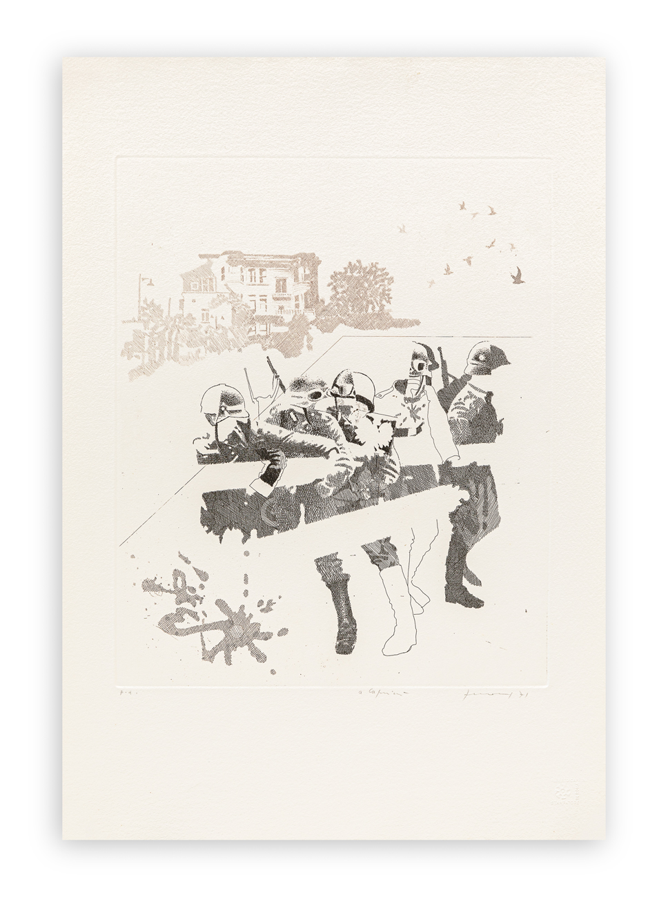 Opera realizzata per il volume 'La costituzione della Repubblica Italiana', Milano, 1972 (originariamente contenente incisioni di Fieschi, Guerreschi, Guttuso, Vespignani). L'opera illustra un momento dell'assalto sferrato dai tedeschi contro la frontiera polacca, all'inizio della seconda guerra mondiale