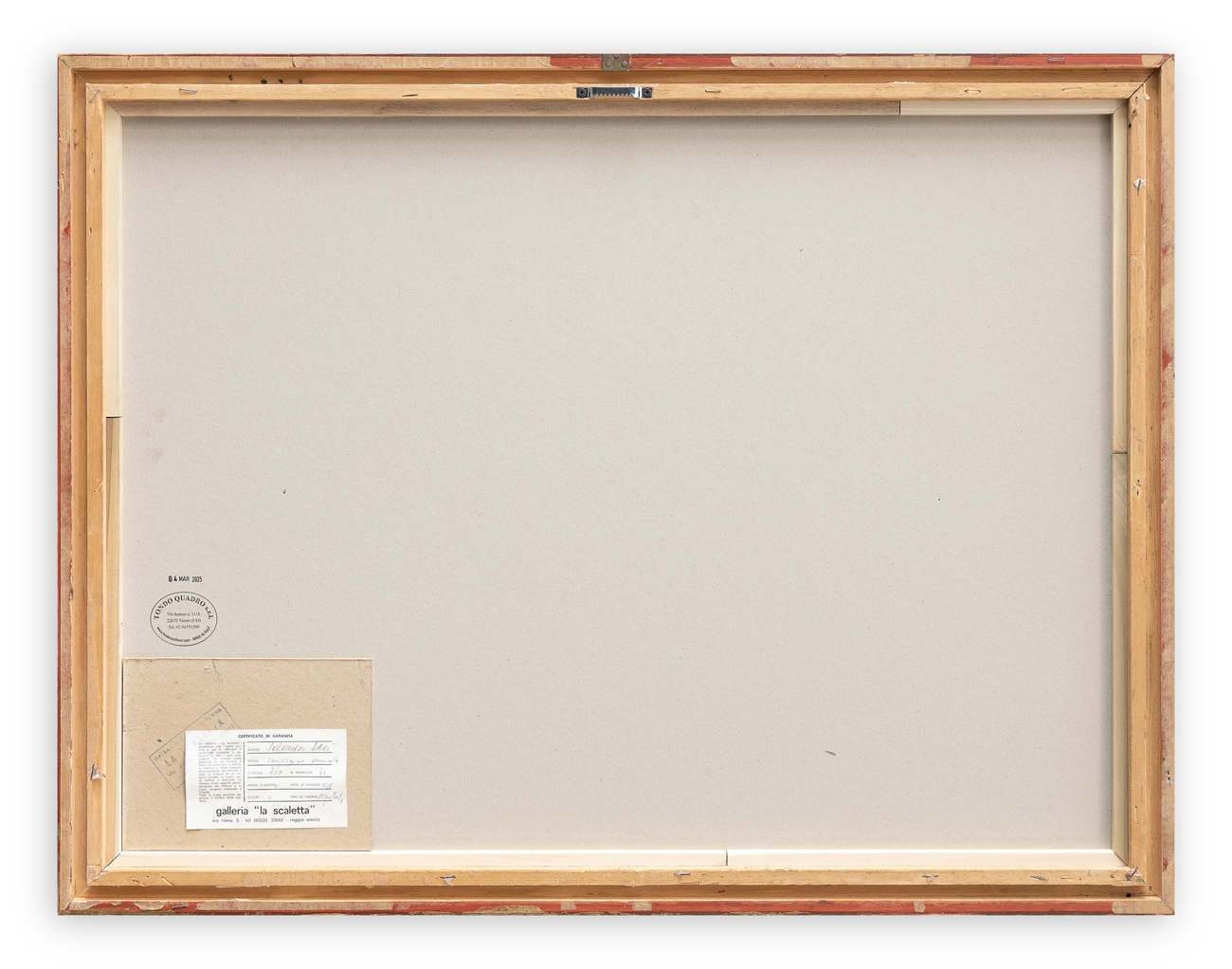 Etichetta e timbro della Galleria La Scaletta (RE) al retro del cartone protettivo