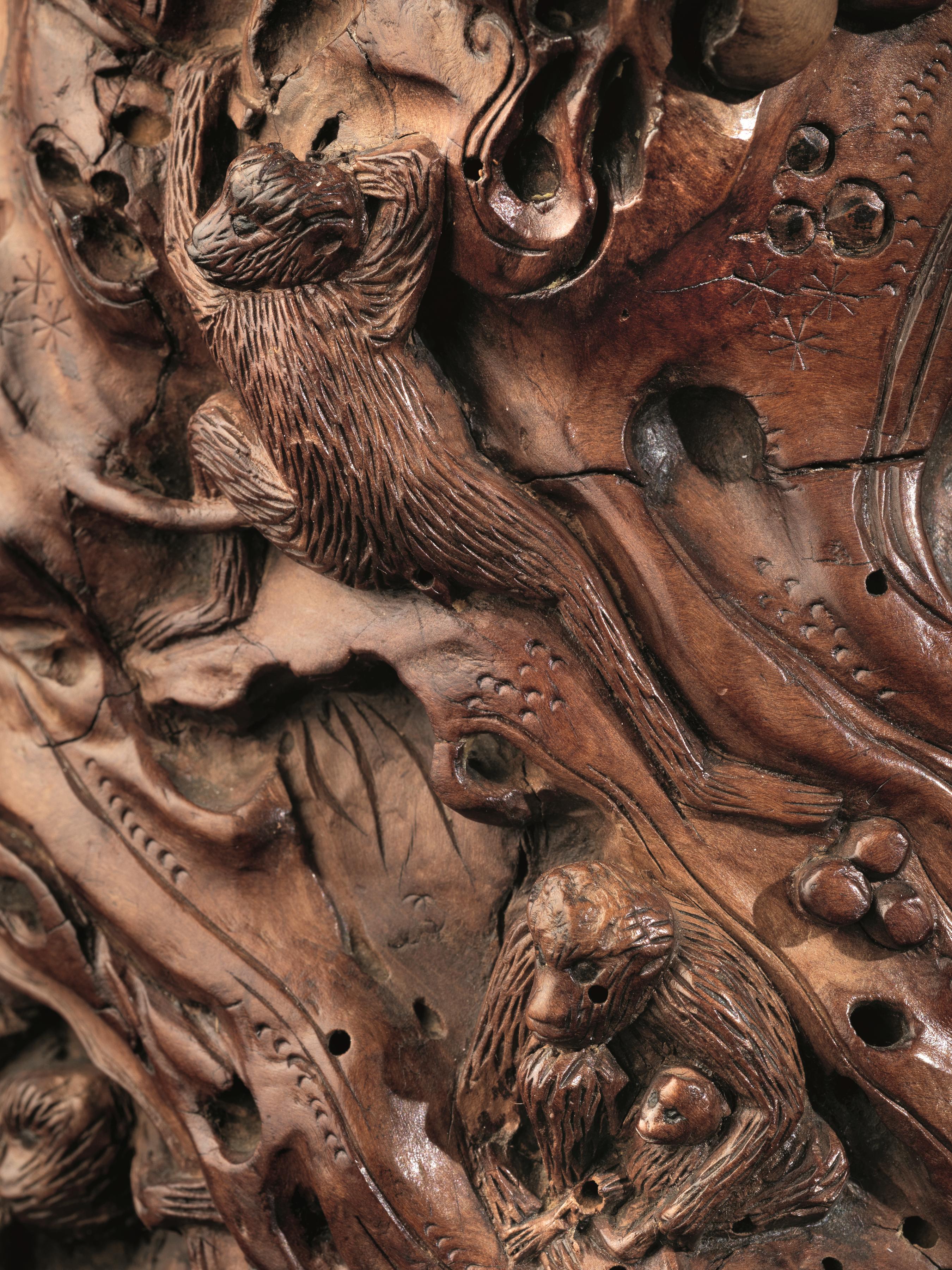 PORTA PENNELLI CINA SEC.XVIIin legno intagliato con cerbiatti e scimmie, alt....