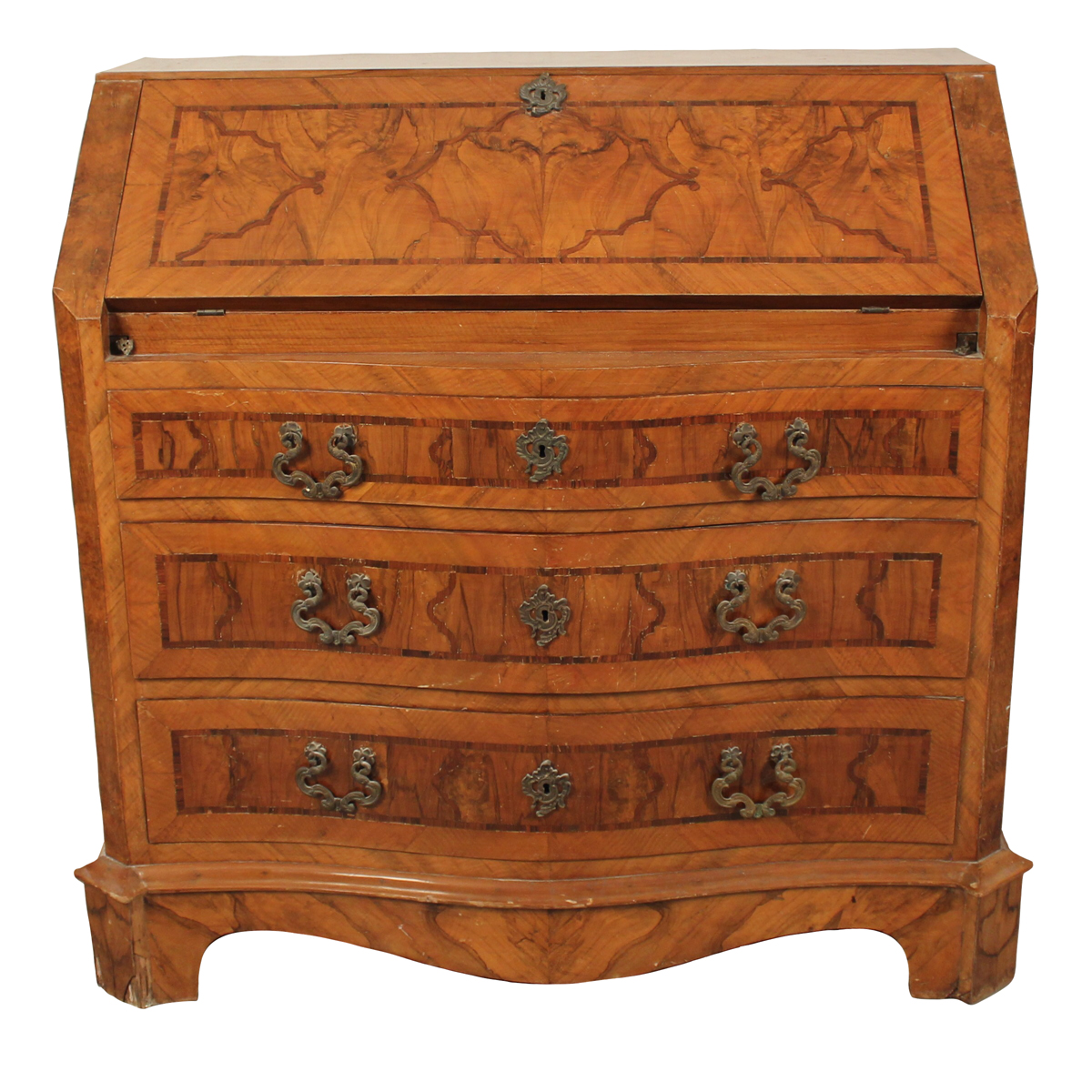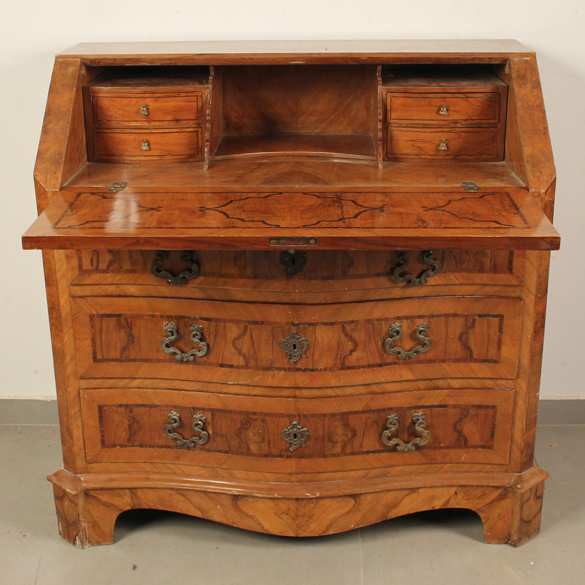 Bureau Radica di noce con intarsi in palissandro e maniglie in bronzo dorato. Ribalta con all'interno piccoli cassetti. Sicilia. Fine secolo XIX. Cm 109x55 h 110
