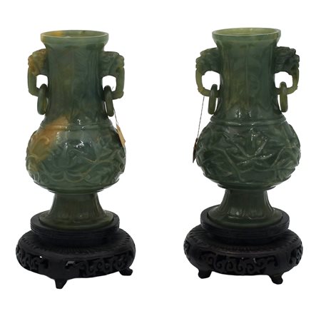 Coppia di piccole anfore Giada con basi in teak. Cina. Secolo XX. Cm h 14,5