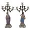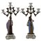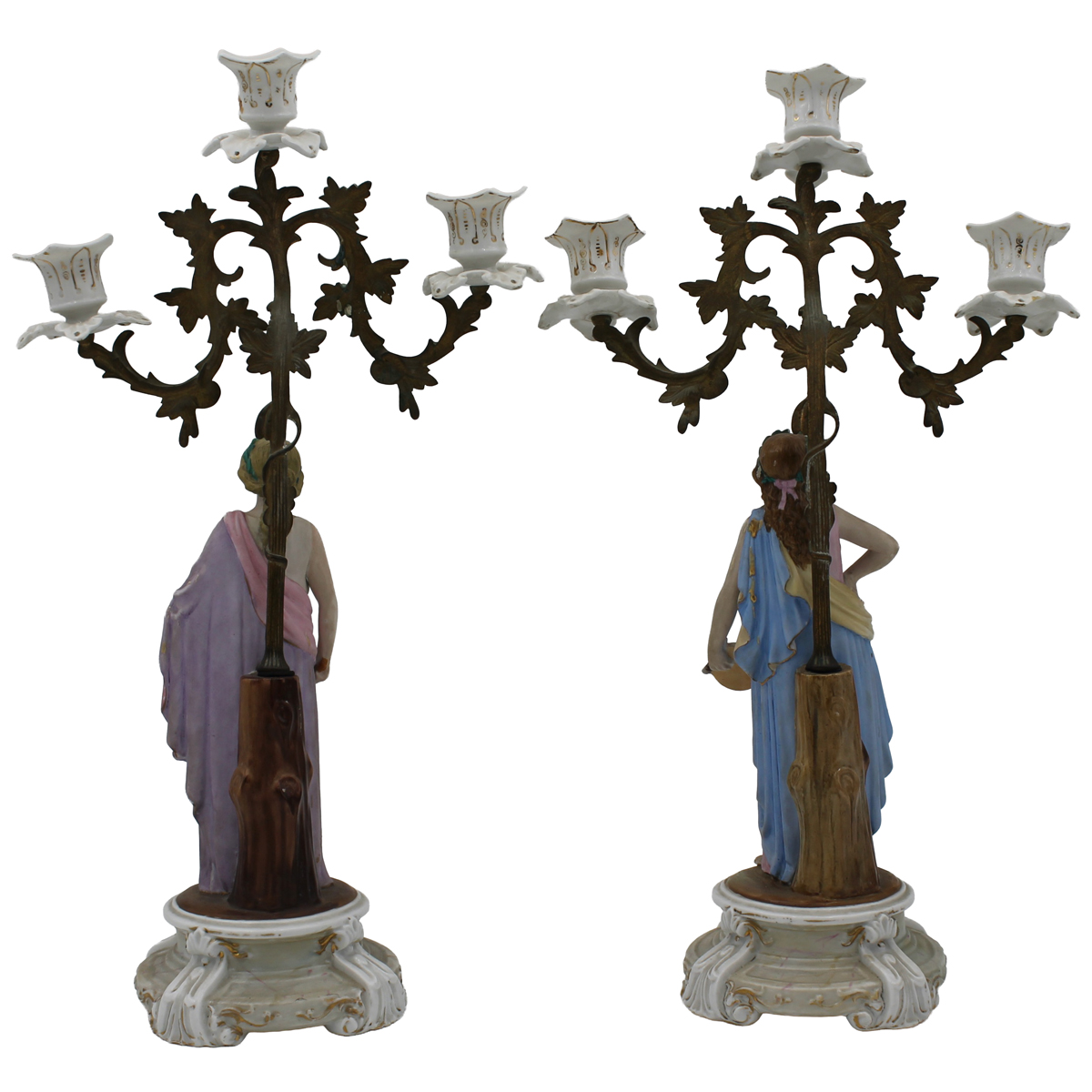 Coppia candelabri a tre fiamme Decorati con figure di vestali in porcellana e biscuit. Francia. Epoca Luigi Filippo. Cm h 43