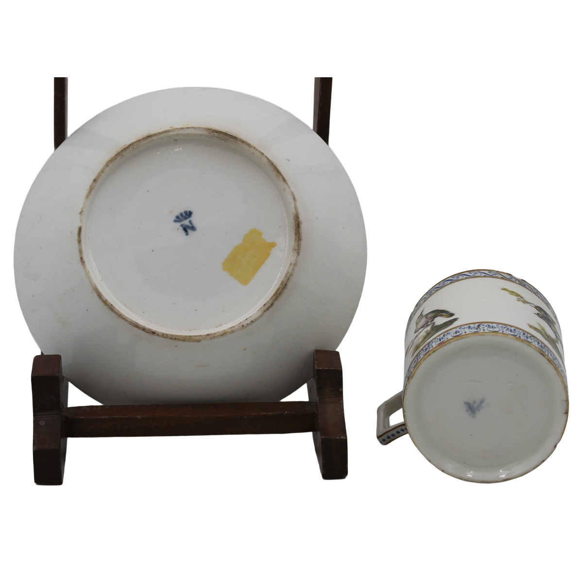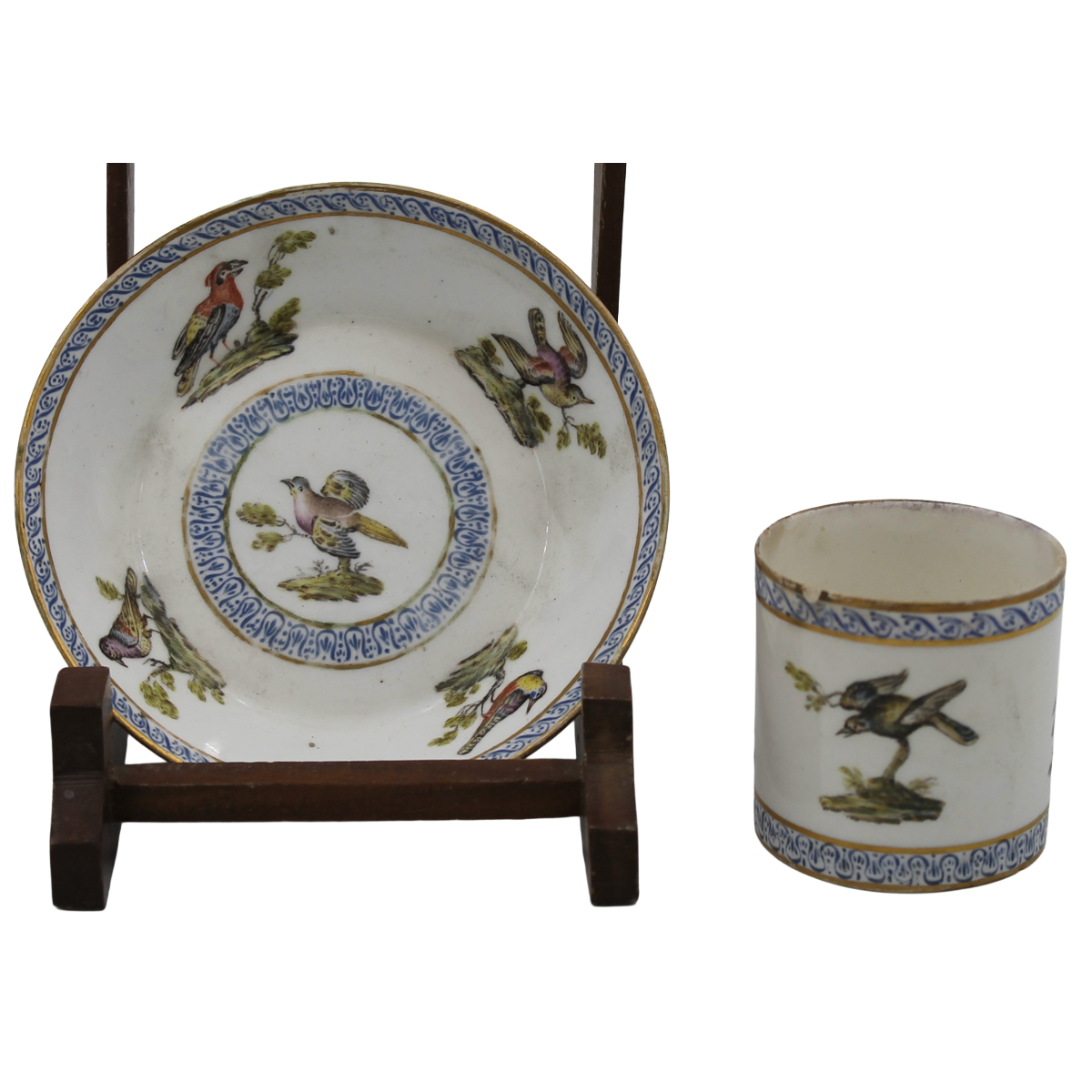 Tazza da caffè con piattino Antica porcellana decorata con volatili e motivi ornamentali policromi. Ginori. Secolo XIX