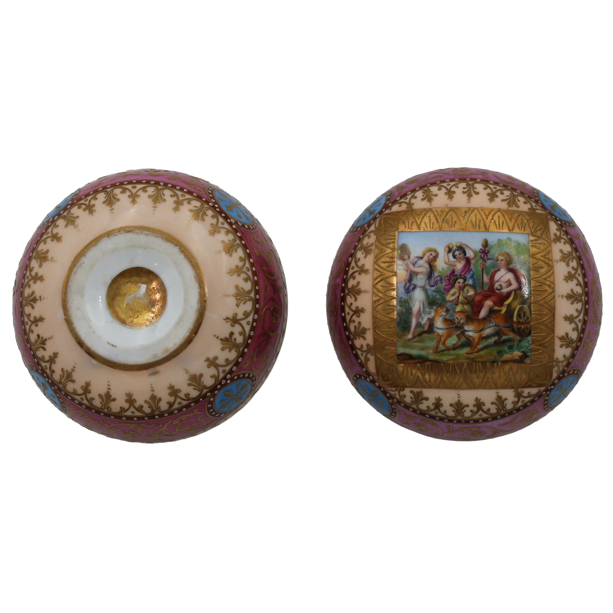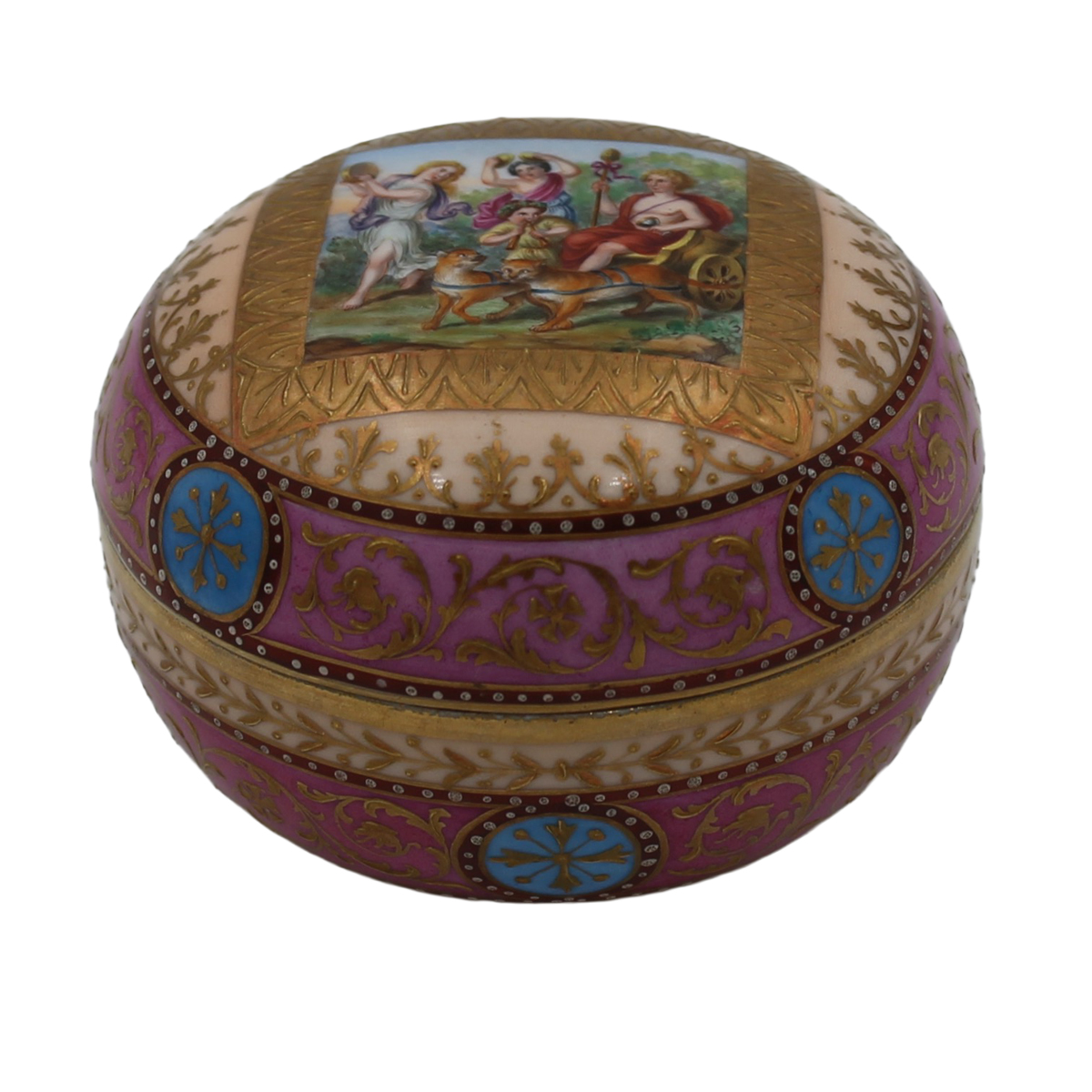 Piccola scatola Antica porcellana decorata con scene classiche policrome. Vienna. Secolo XIX. CM d 9