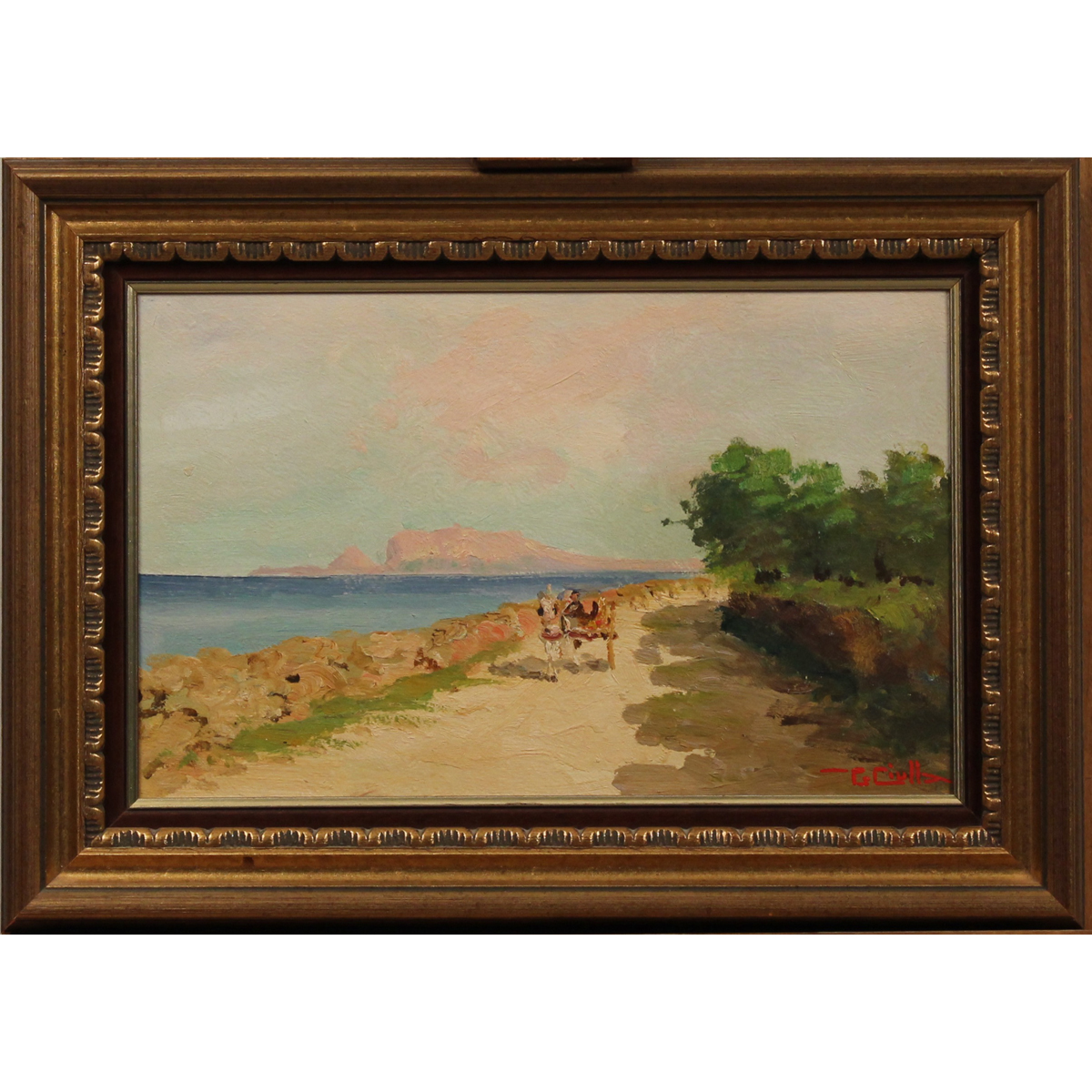 Giuseppe Ciulla (1914/?) "Strada di Romagnolo con carretto" Dipinto ad olio su cartone in cornice dorata. Cm 21x34