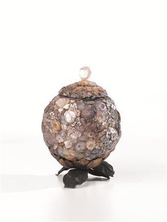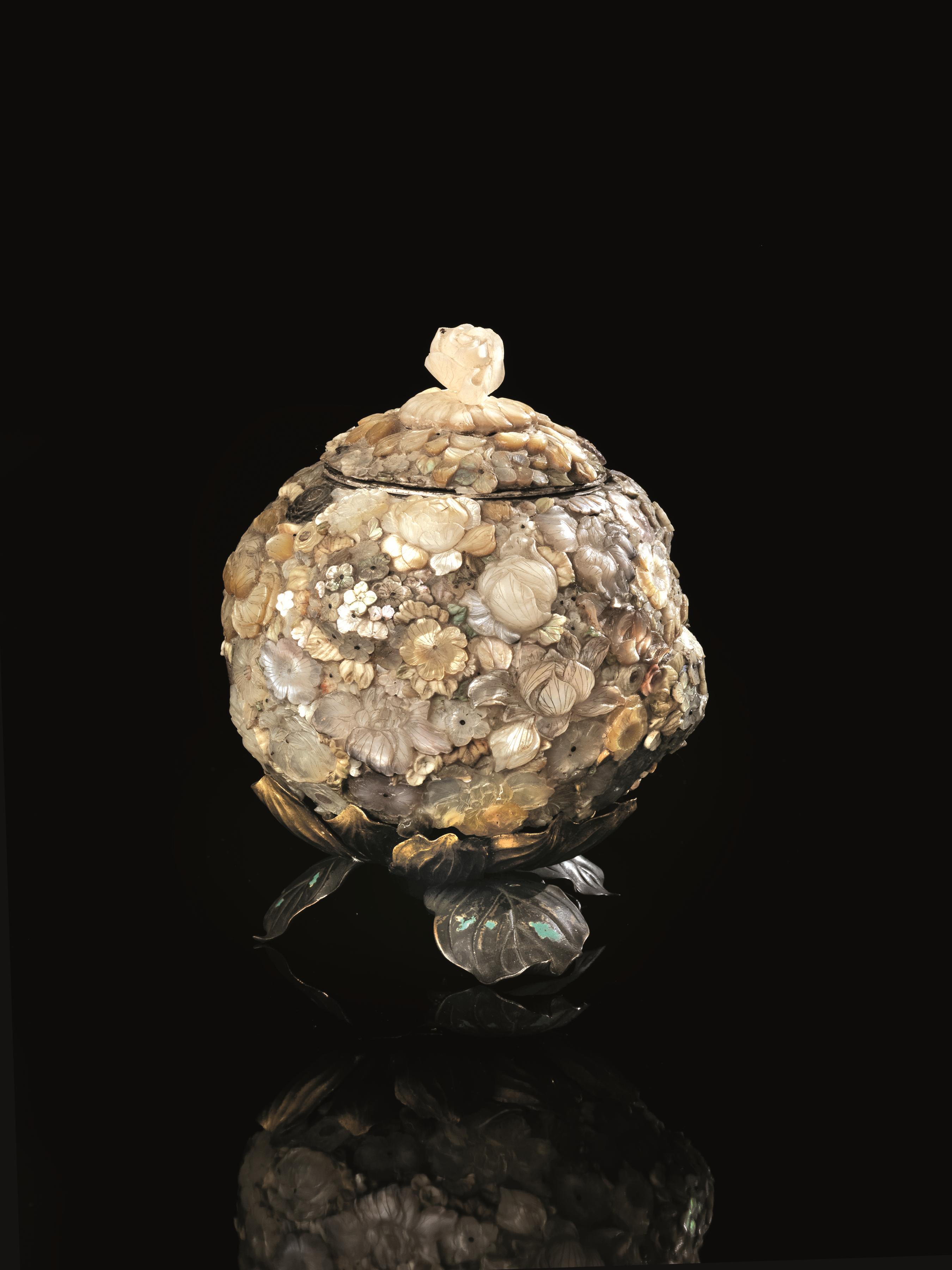 CONTENITORE SFERICO, GIAPPONE, PERIODO MENJIinteramente rivestito di fiori in...