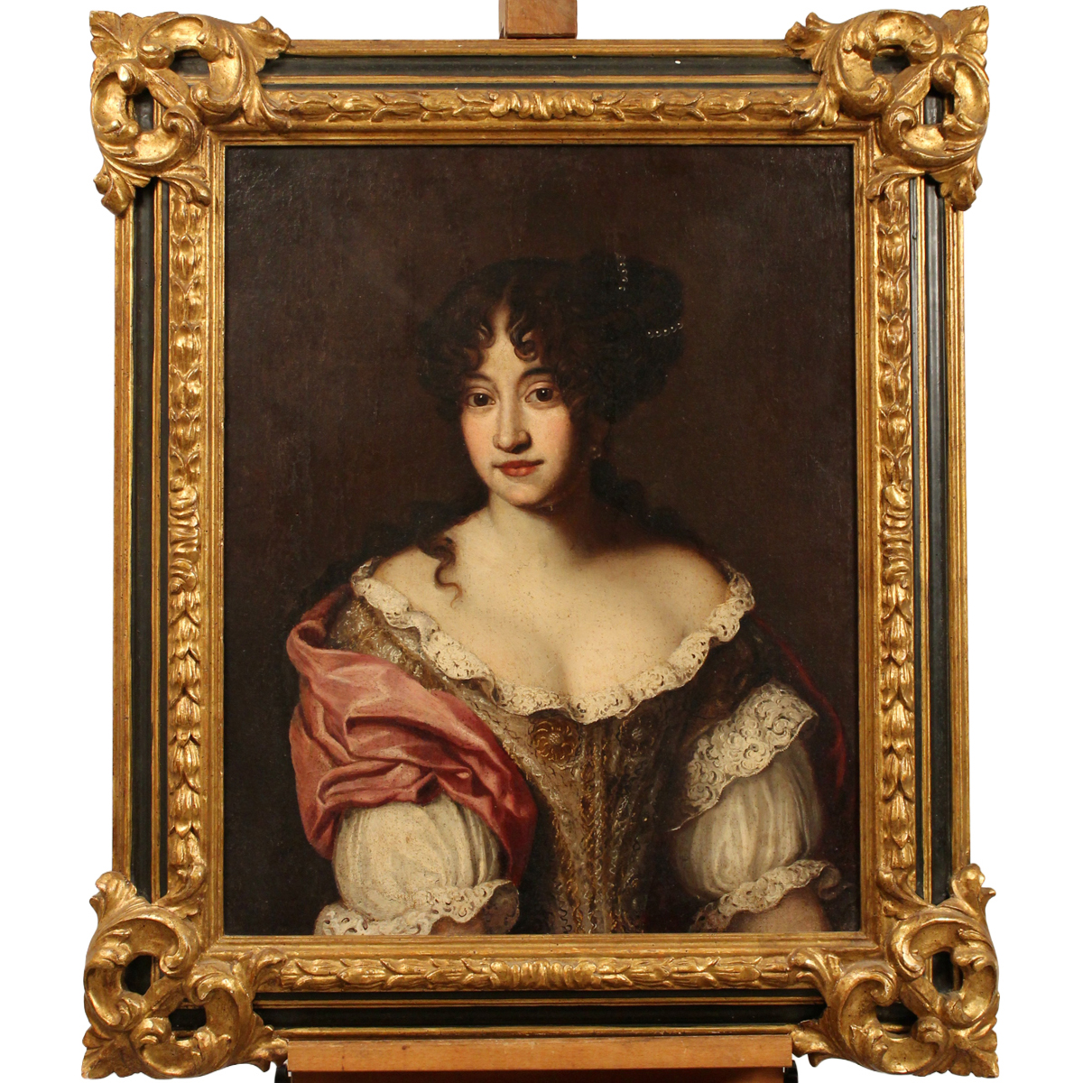 Jacob Ferdinand Voet (1639/1689) (attr.) "Figura di nobildonna" Dipinto ad olio su tela in cornice in legno dorato (restauri e rifodero). Cm 74x60