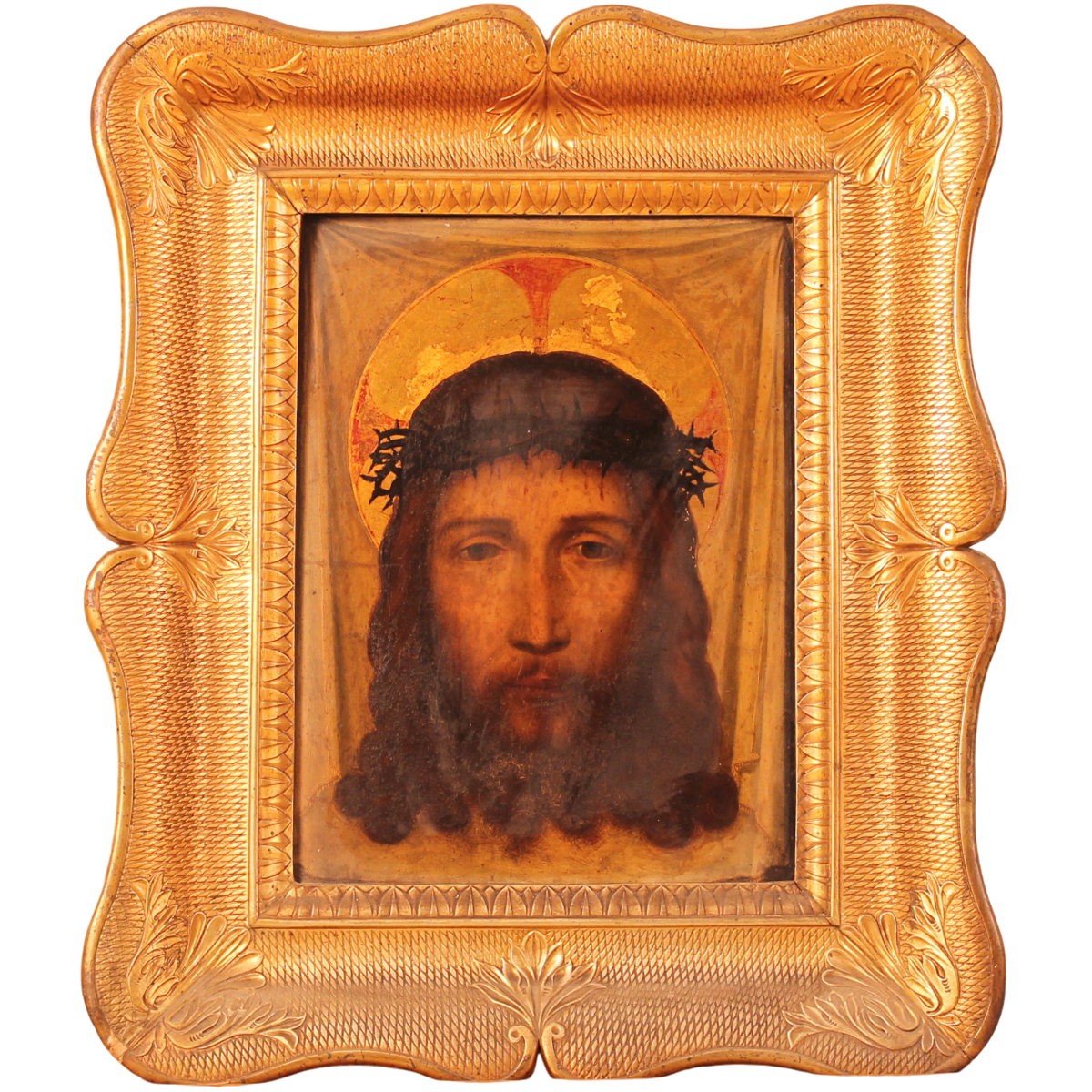 Pittore italiano della fine del secolo XVIII "Ecce Homo" Dipinto ad olio su tavola in cornice in legno dorato a vassoio con motivi vegetali incisi (restauri). Cm 37x27,5
