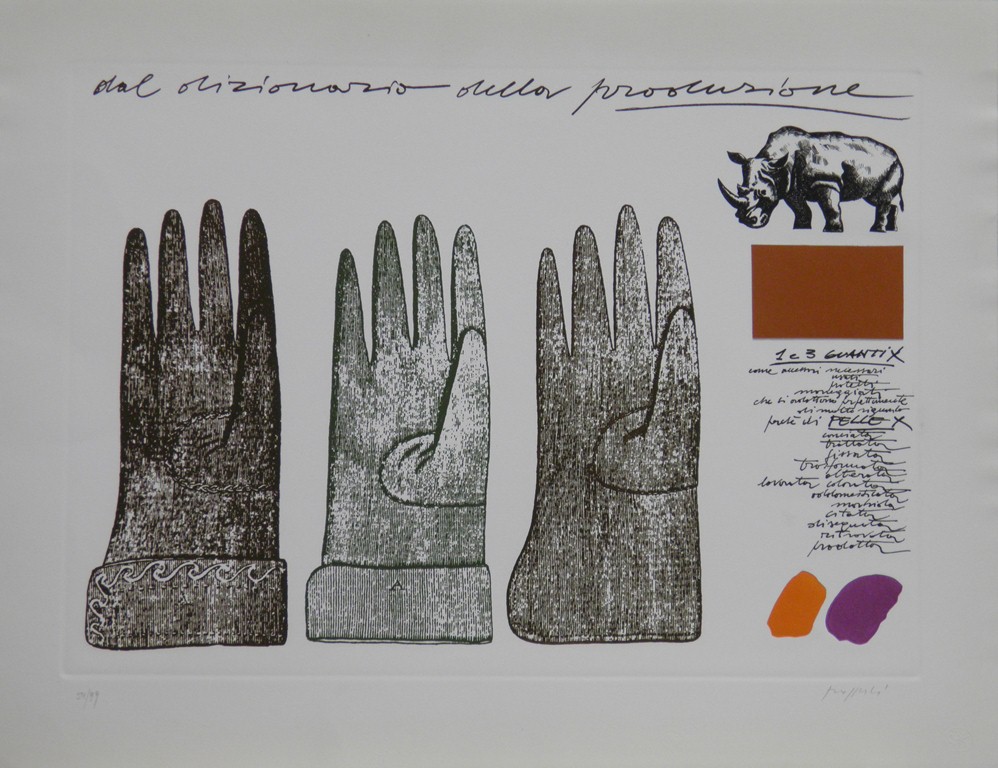 POZZATI CONCETTO VO' VECCHIO 1935 DAL DIZIONARIO DELLA PRODUZIONE UNO E TRE GUANTI, 1974 ACQUAFORTE E COLLAGE cm 50 x 65 Firma in basso a destra Edizione Nuovo Torcoliere Esemplare 54/99