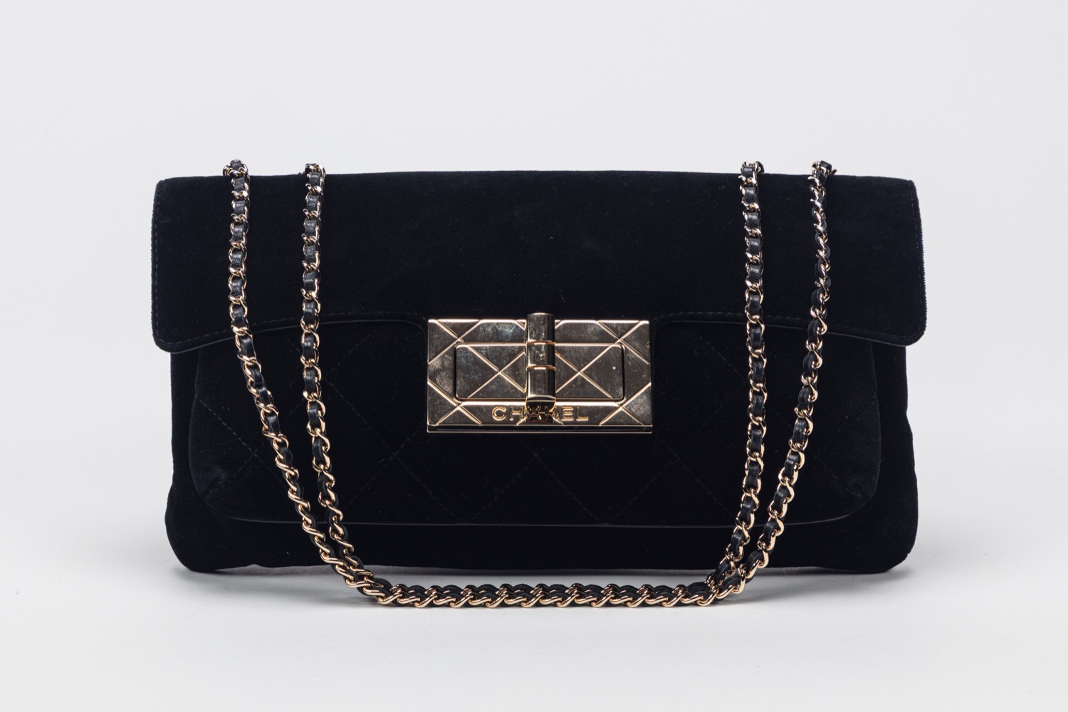 in velluto color nero, dettagli e tracolla a catena in metallo dorato, interno in tessuto logato, cm 30 (lievissimi segni d'uso)in velluto color nero, dettagli e tracolla a catena in metallo dorato, interno in tessuto logato, cm 30 (lievissimi segni d'uso)