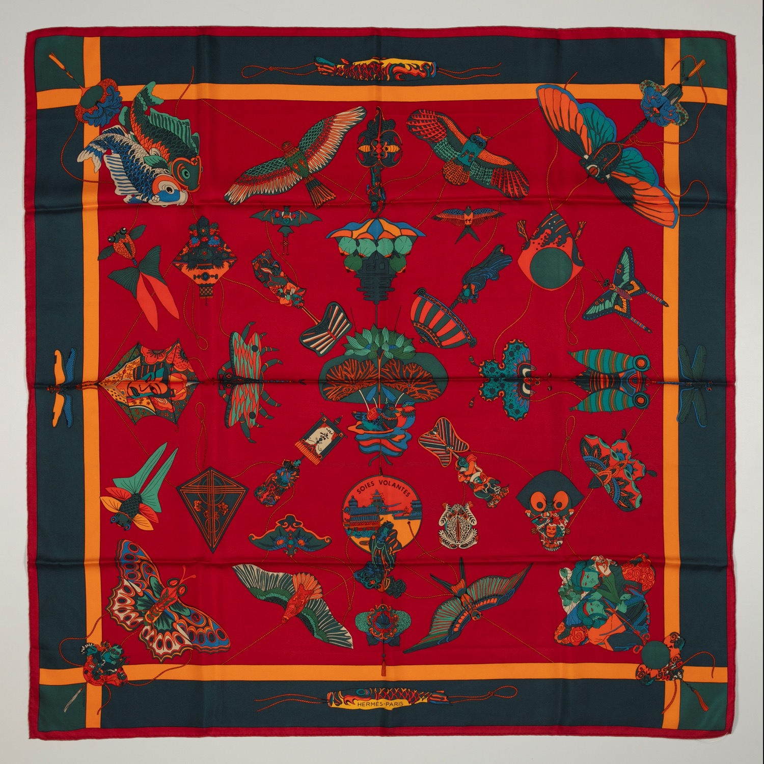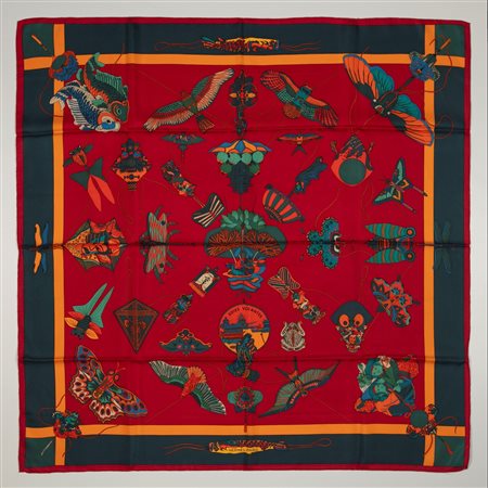 in seta su fondo color rosso, bordo color bluette, Loïc Dubigeon (raro)in seta su fondo color rosso, bordo color bluette, Loïc Dubigeon (raro)