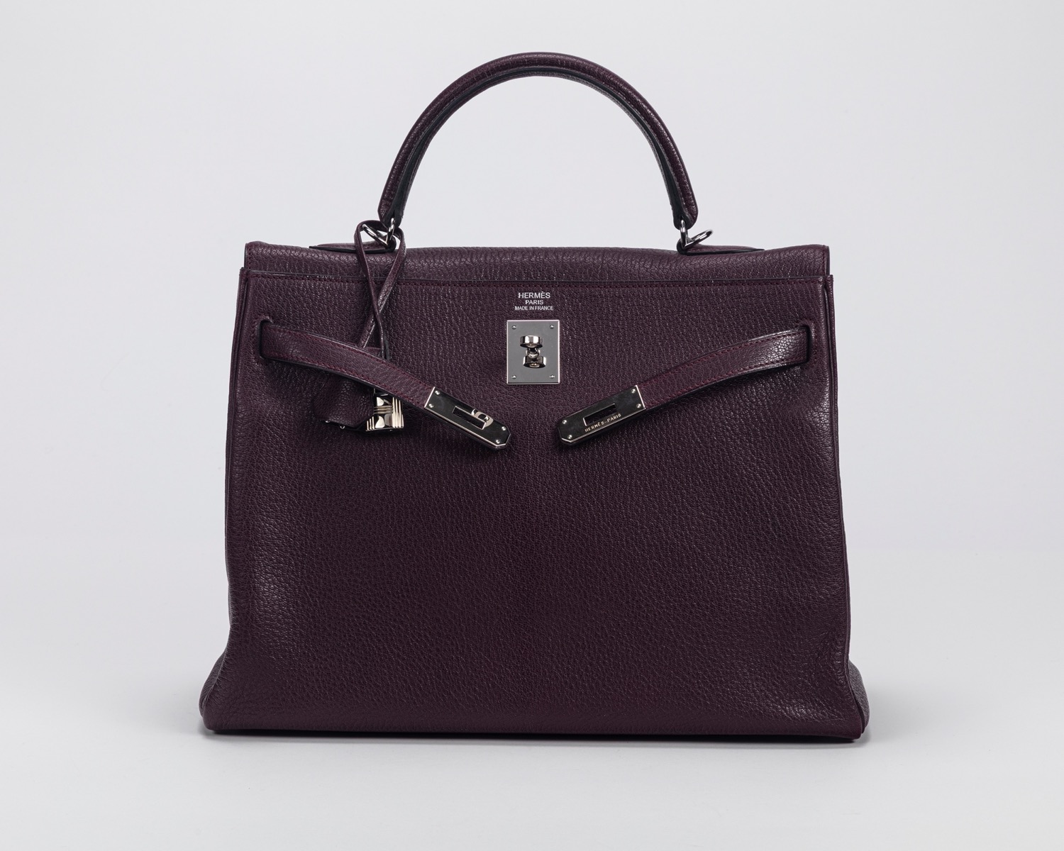 in pelle chevre color raisin, dettagli in palladio, con tracolla staccabile, cm 35, con sacchetto (lievi segni d'uso)in pelle chevre color raisin, dettagli in palladio, con tracolla staccabile, cm 35, con sacchetto (lievi segni d'uso)