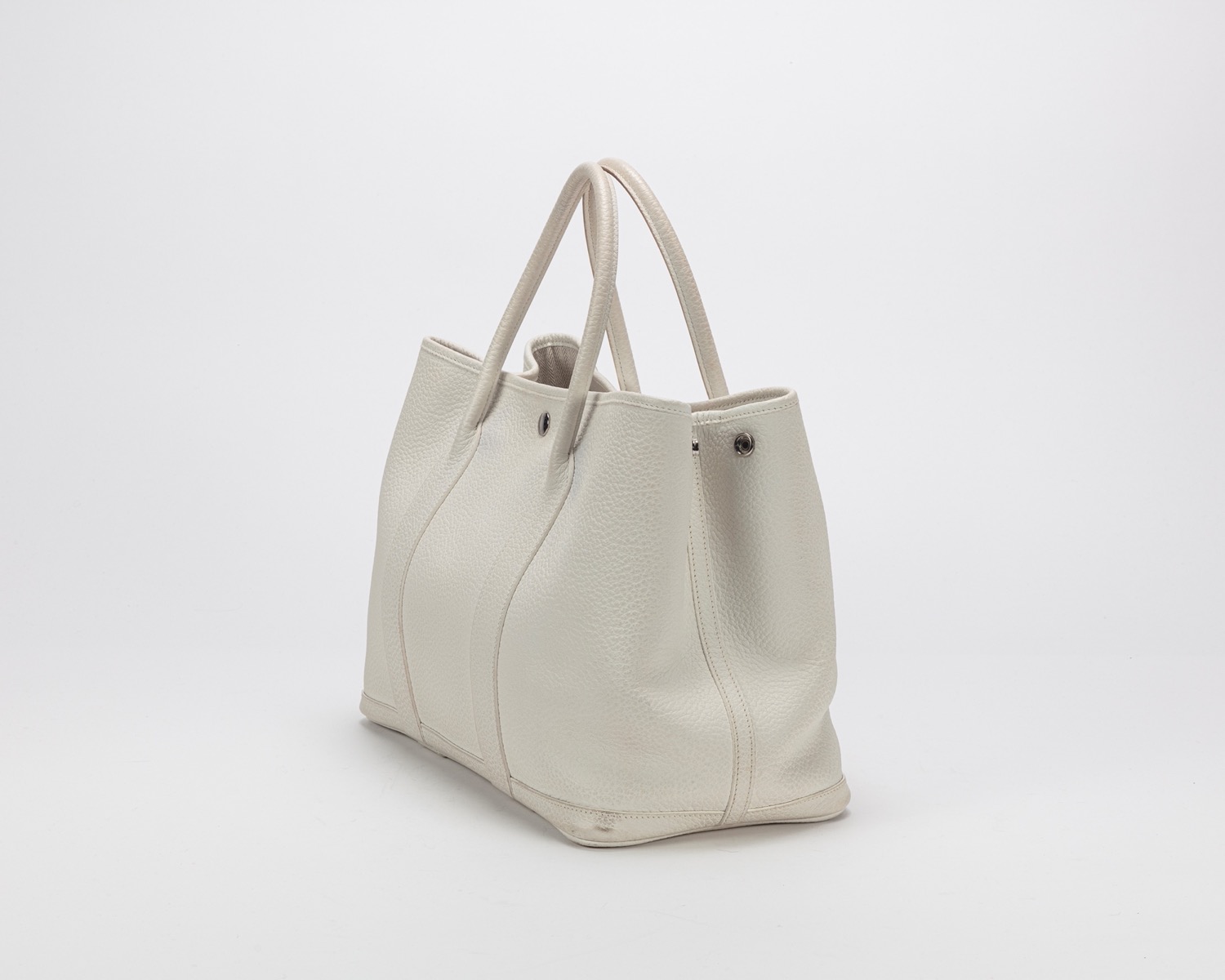 in pelle clémence color bianco, dettagli in palladio, cm 36, con sacchetto (lievi segni d'uso)in pelle clémence color bianco, dettagli in palladio, cm 36, con sacchetto (lievi segni d'uso)