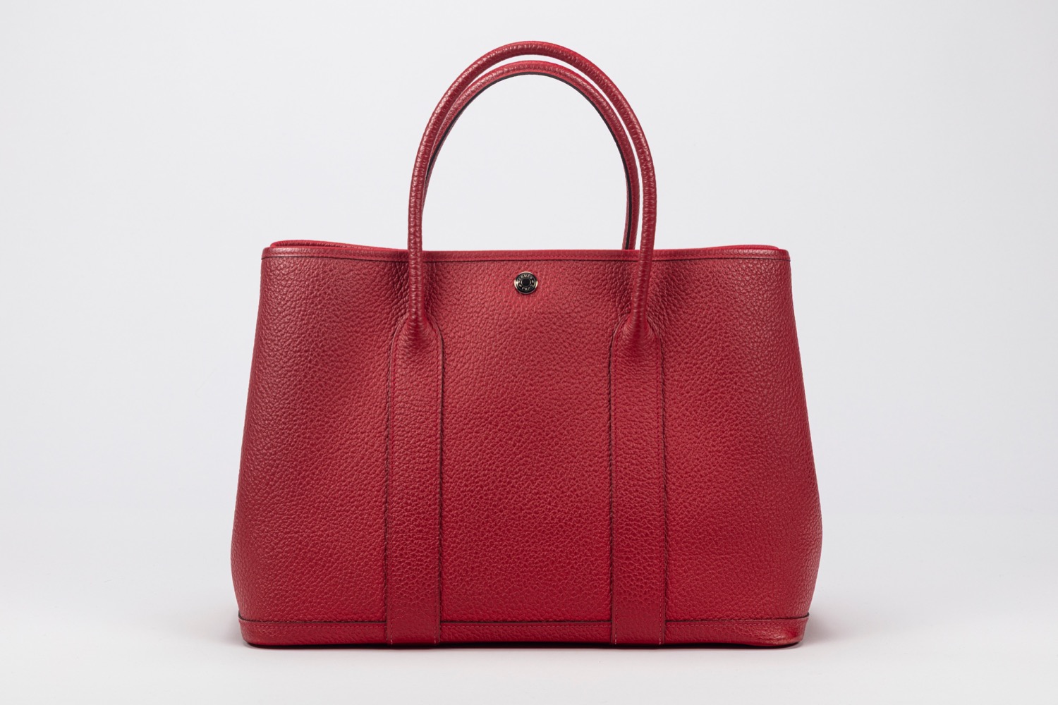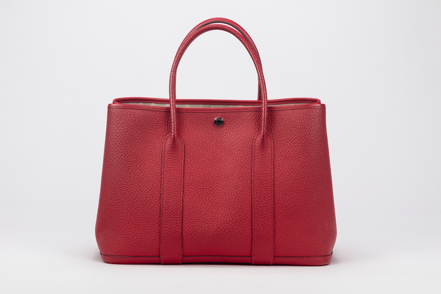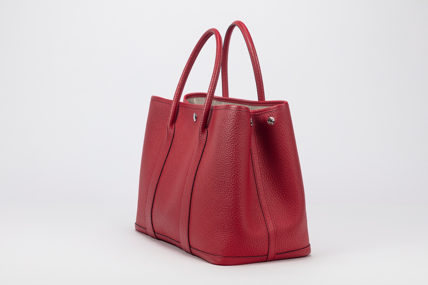 in pelle Clemence color rosso, interno in tela, dettagli in palladio, cm 36, con sacchetto (lievi segni d'uso)in pelle Clemence color rosso, interno in tela, dettagli in palladio, cm 36, con sacchetto (lievi segni d'uso)