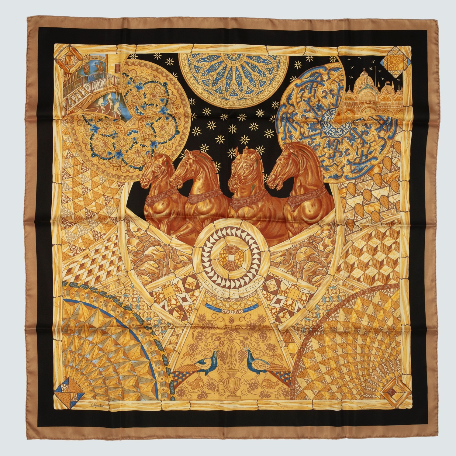in seta su fondo color nero, bordo color beige, Julie Abadie, con scatola in seta su fondo color nero, bordo color beige, Julie Abadie, con scatola