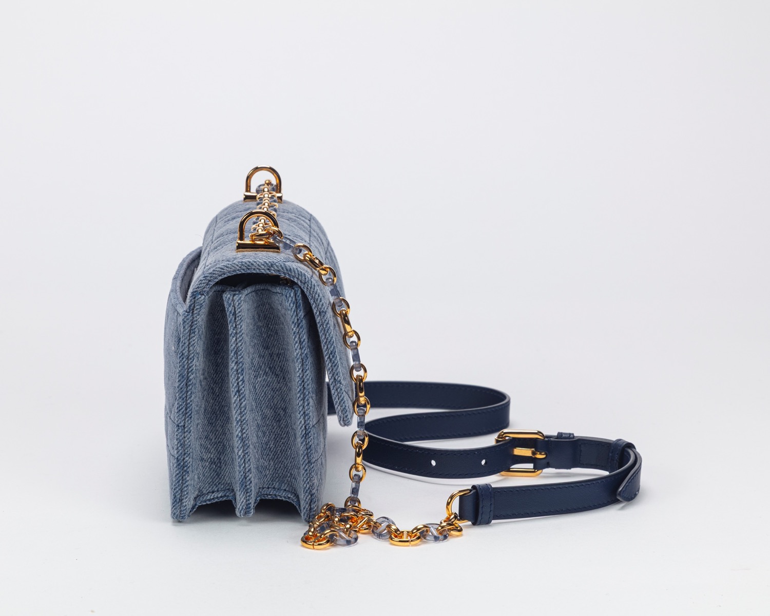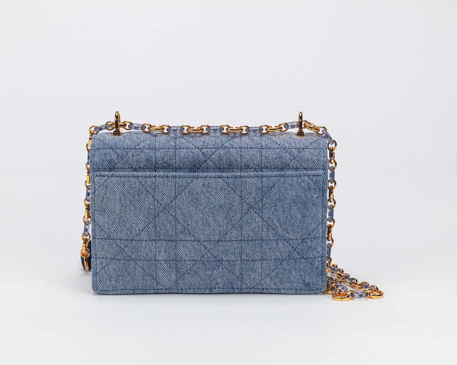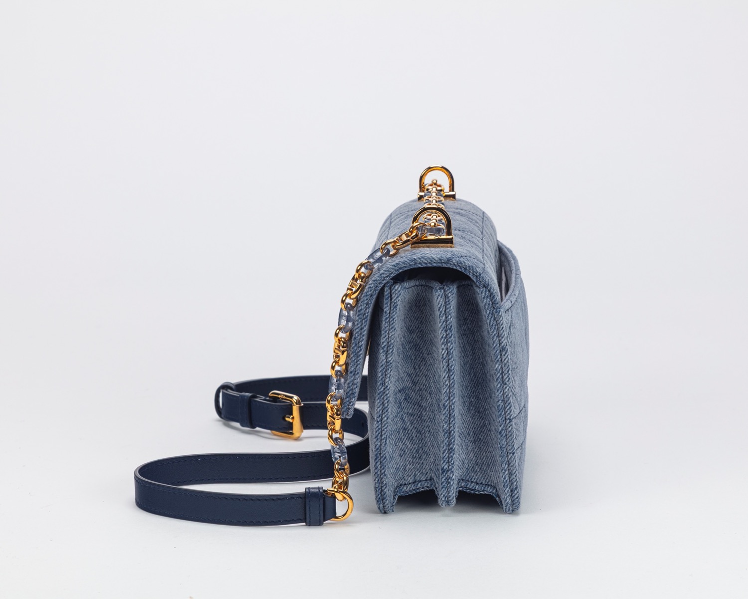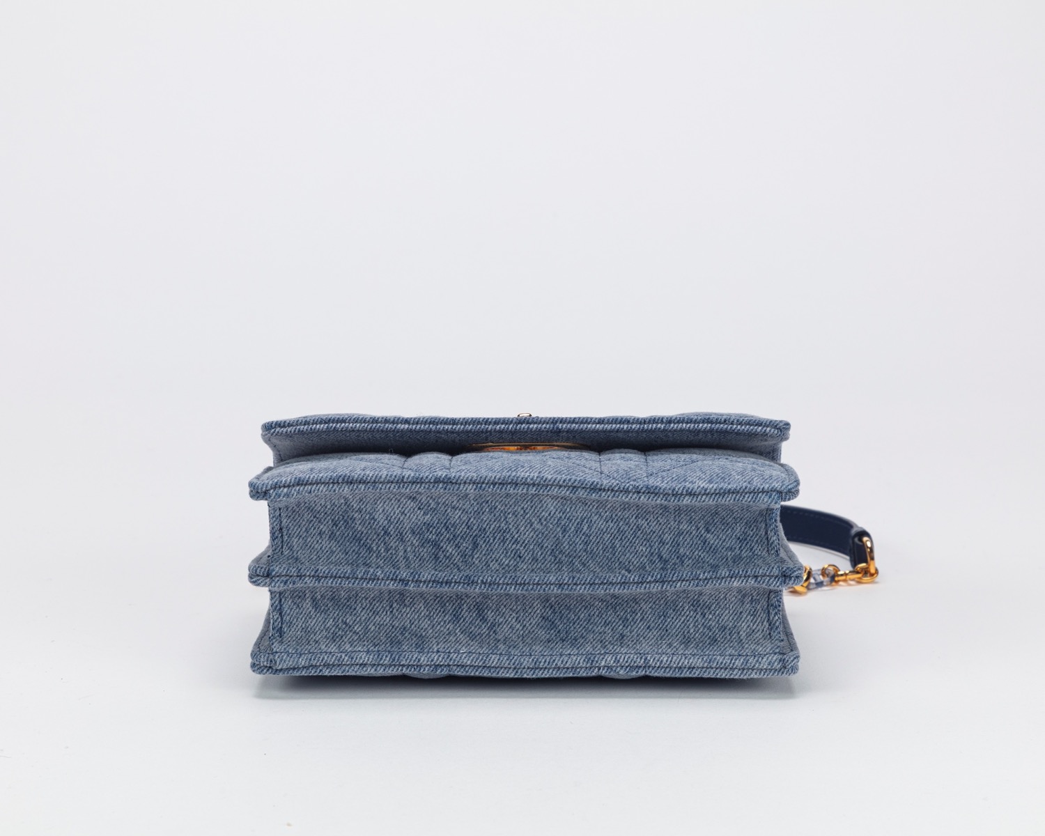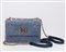 in tela denim macrocannage, con tracolla a catena, dettagli in metallo dorato e resina color azurro, cm 19, con sacchettoin tela denim macrocannage, con tracolla a catena, dettagli in metallo dorato e resina color azurro, cm 19, con sacchetto