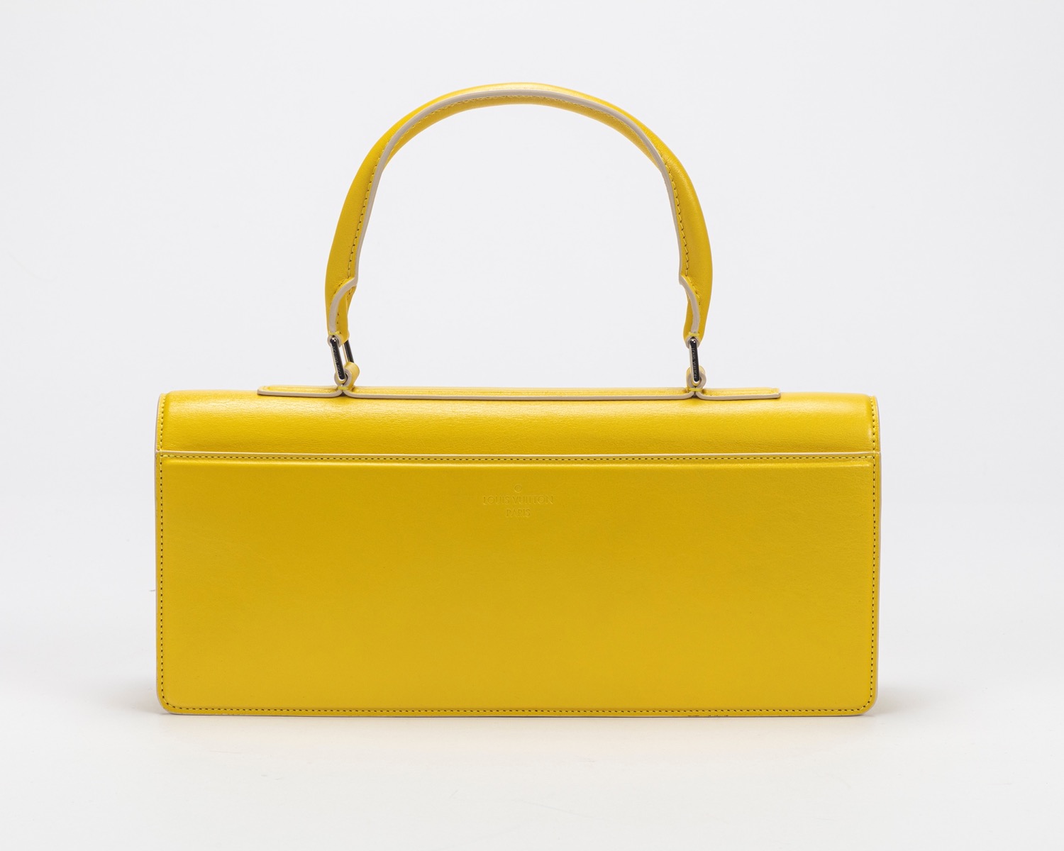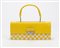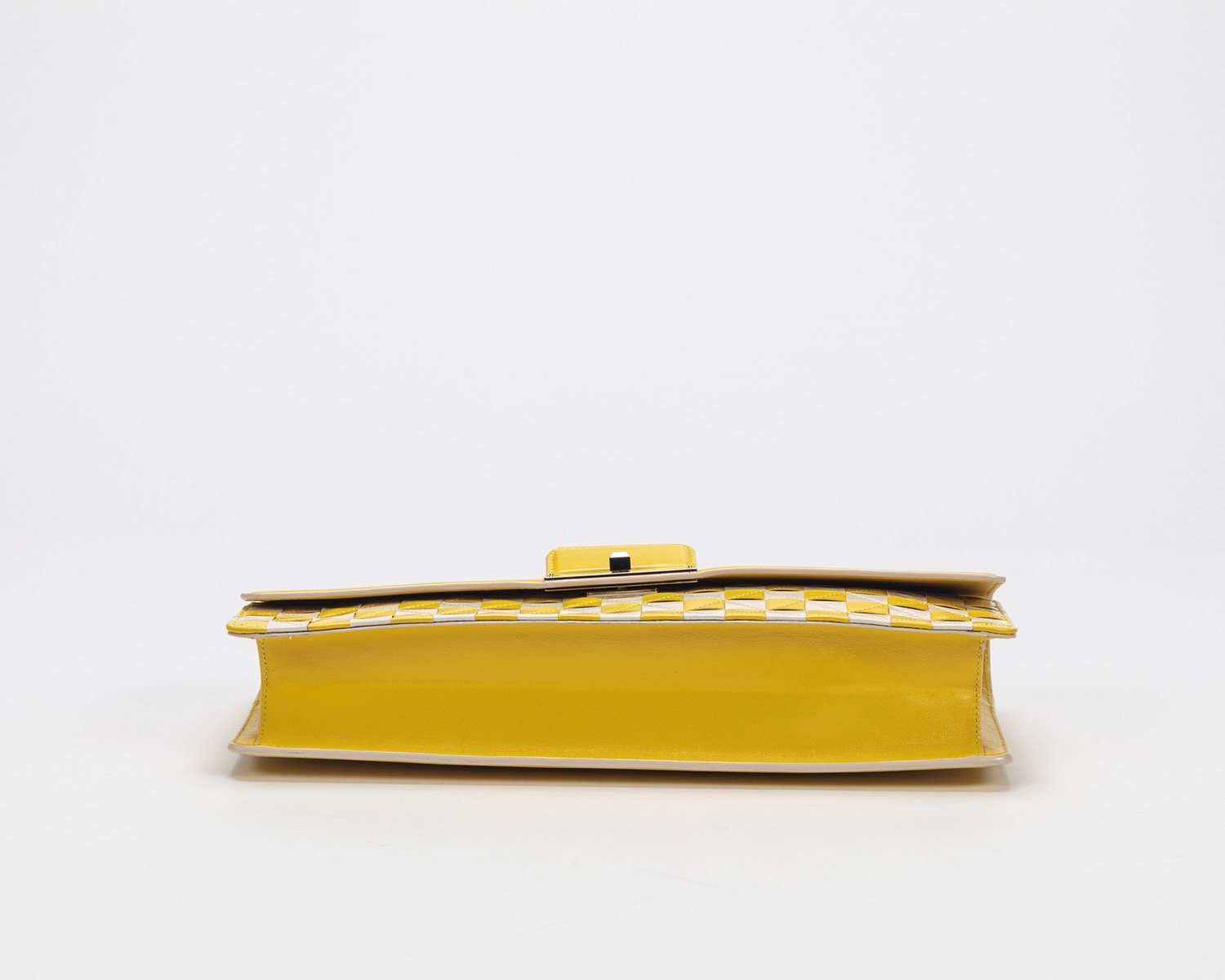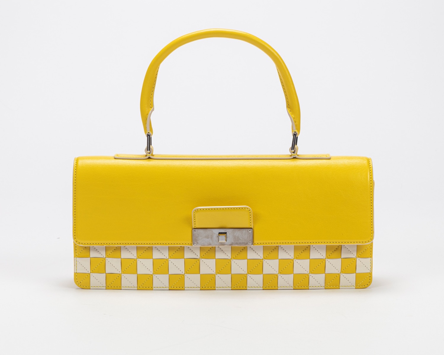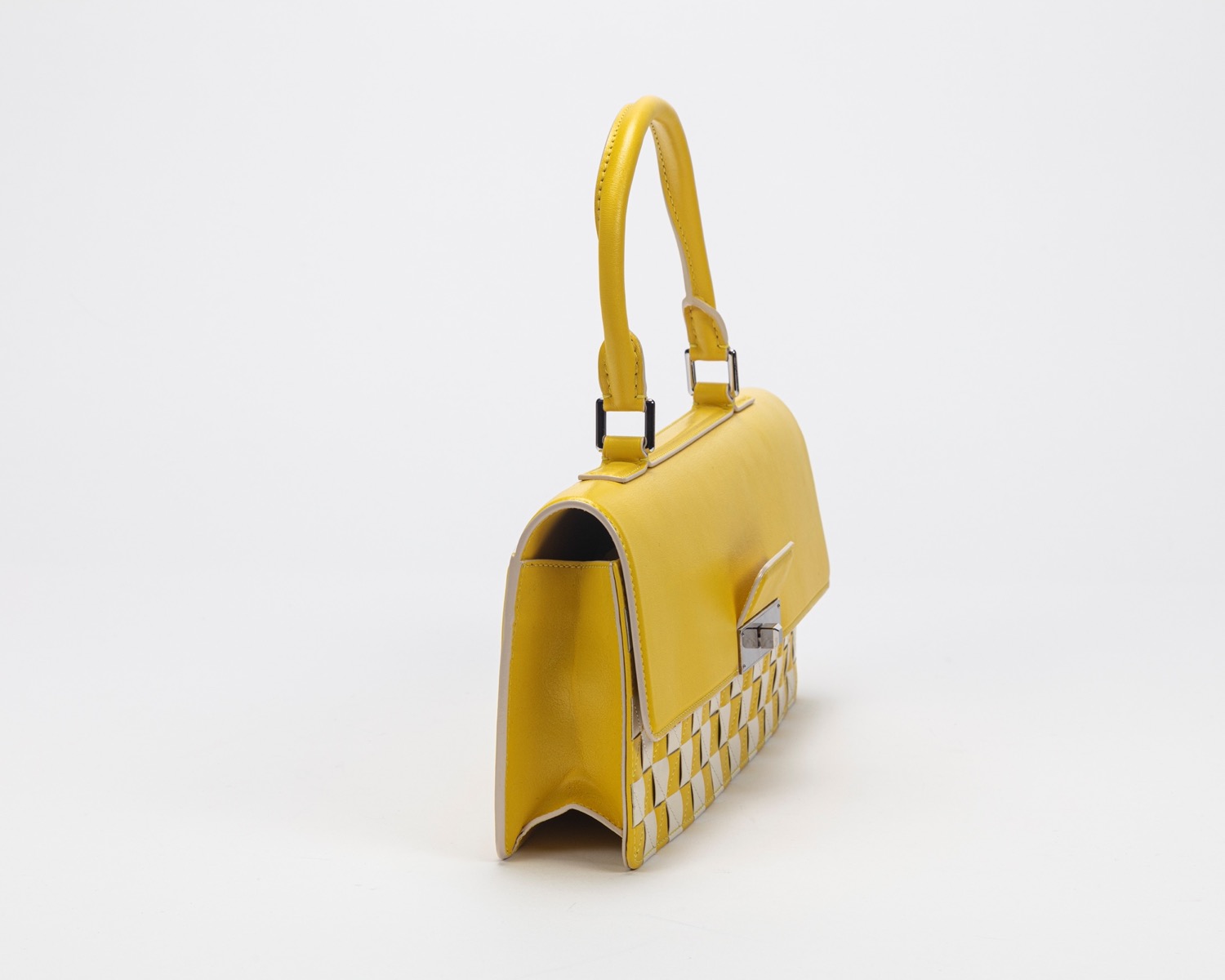 in pelle color giallo e bianco, dettagli in metallo dorato, cm 32, con sacchettoin pelle color giallo e bianco, dettagli in metallo dorato, cm 32, con sacchetto