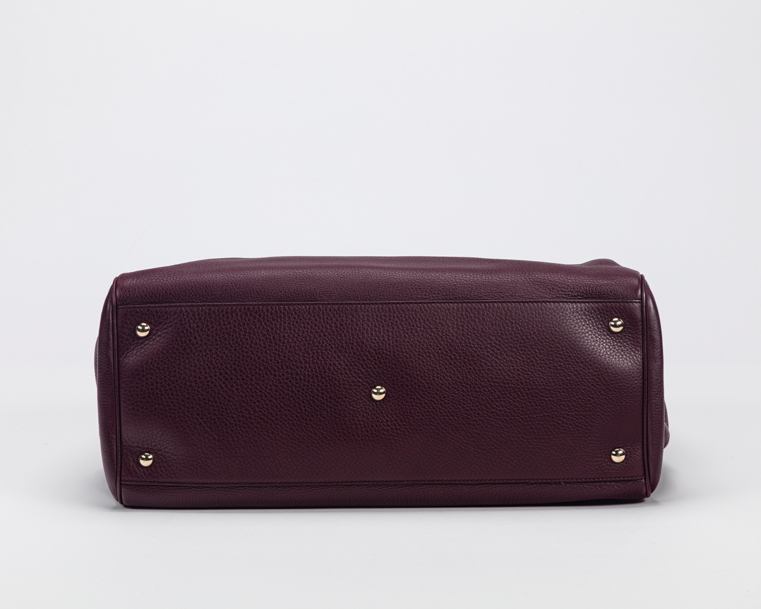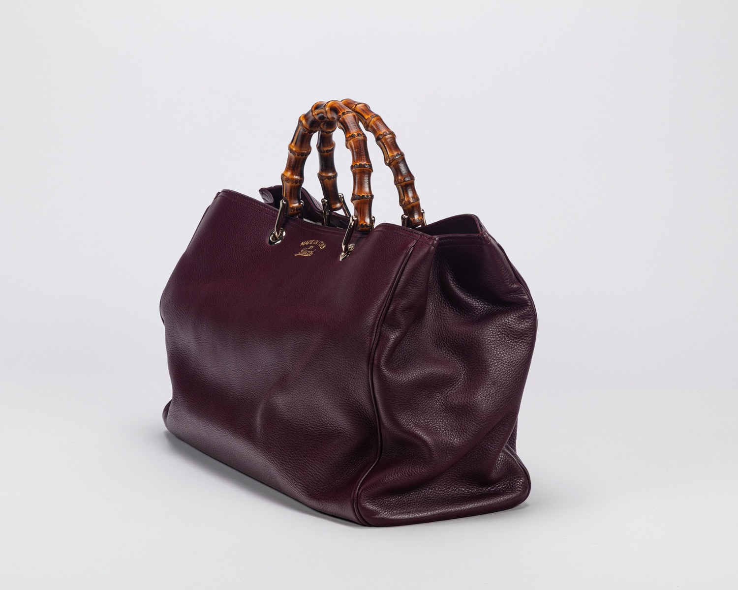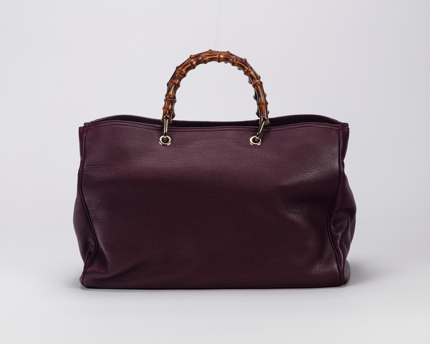 in pelle color bordeaux, doppi manici in bambù, doppio scomparto interno, fodera in tela, dettagli in metallo, con tracolla staccabile, cm 40, con sacchetto (lievi segni d'uso)in pelle color bordeaux, doppi manici in bambù, doppio scomparto interno, fodera in tela, dettagli in metallo, con tracolla staccabile, cm 40, con sacchetto (lievi segni d'uso)