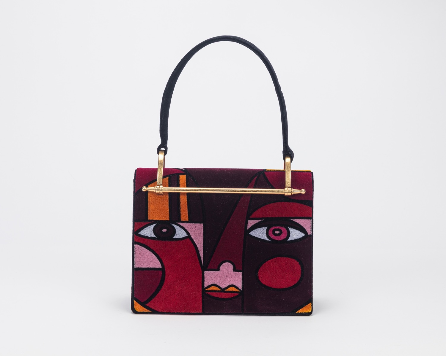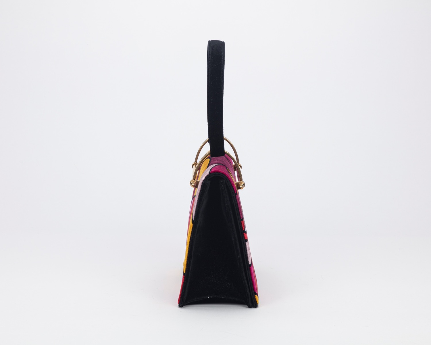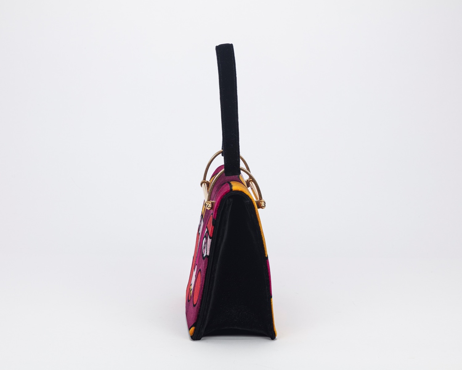 in velluto stampato multicolor, designer Liselotte Watkins, dettagli in metallo dorato, cm 26, con sacchetto (lievissimi segni d'uso)in velluto stampato multicolor, designer Liselotte Watkins, dettagli in metallo dorato, cm 26, con sacchetto (lievissimi segni d'uso)