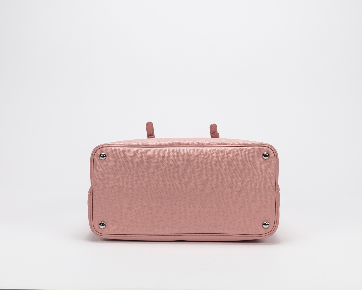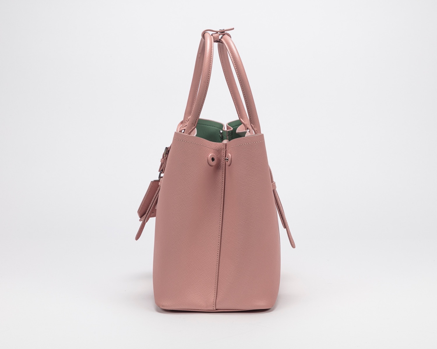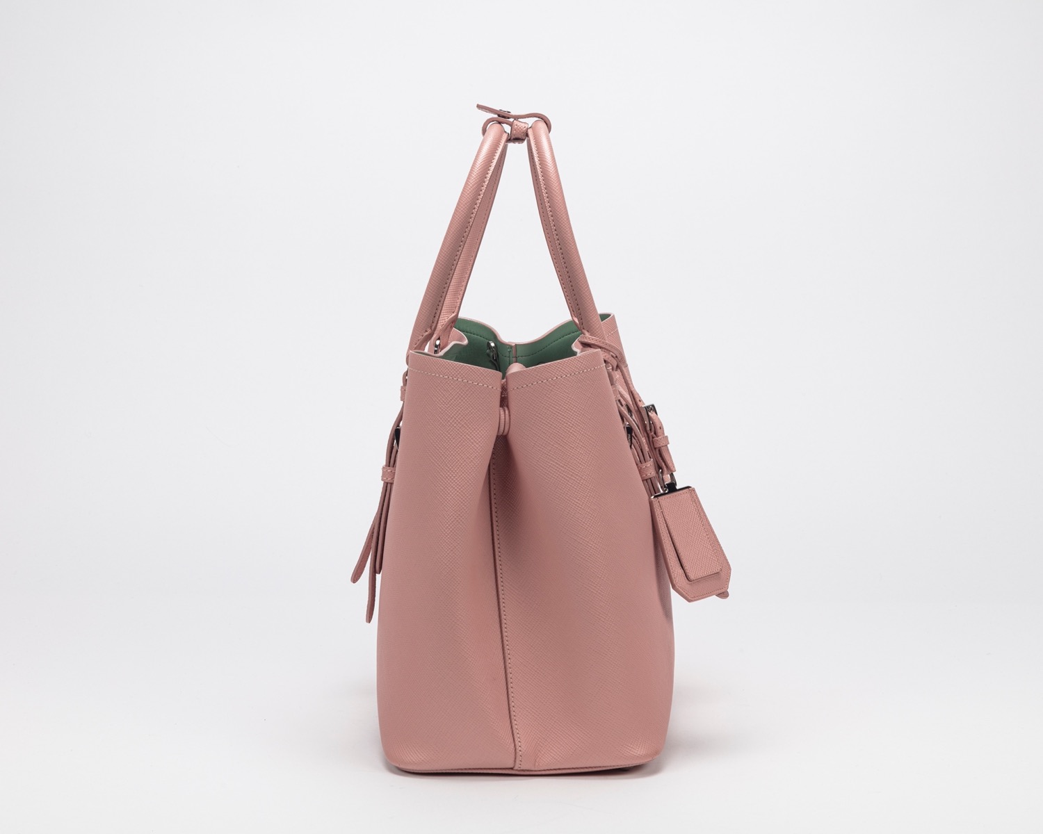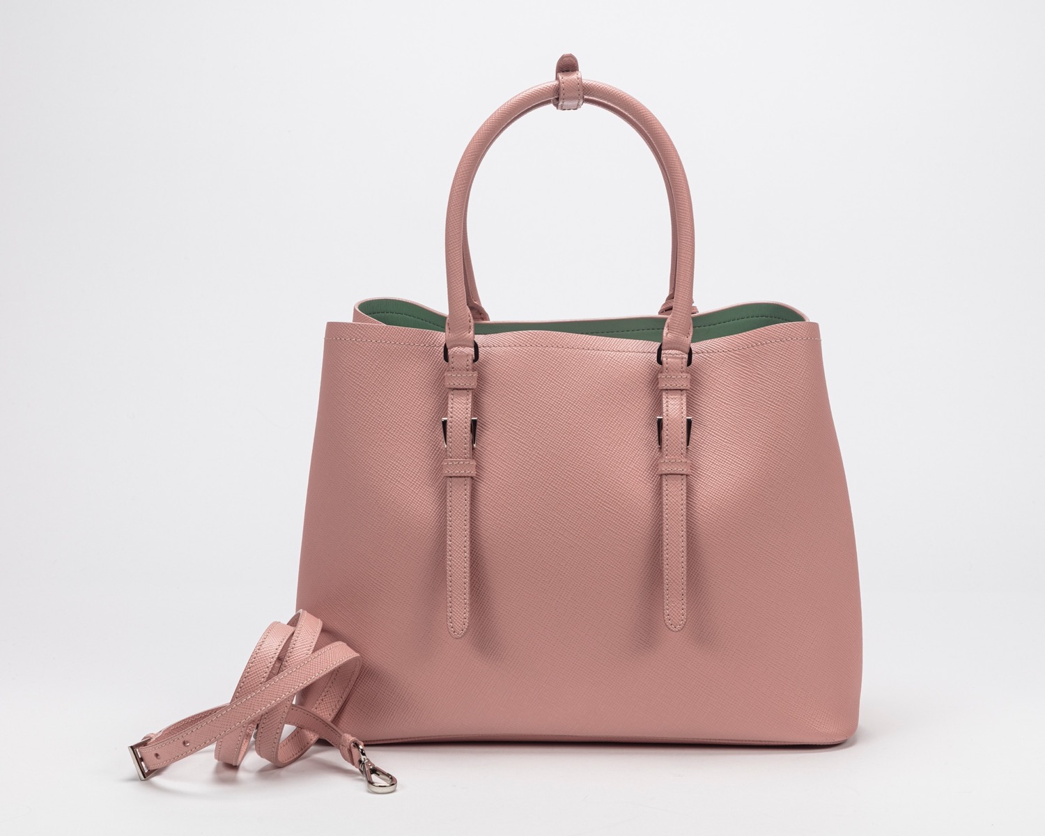 con doppi manici in pelle saffiano color rosa, interno in pelle verde menta, tracolla staccabile, dettagli in metallo, cm 36, con sacchetto (segni d'uso)con doppi manici in pelle saffiano color rosa, interno in pelle verde menta, tracolla staccabile, dettagli in metallo, cm 36, con sacchetto (segni d'uso)