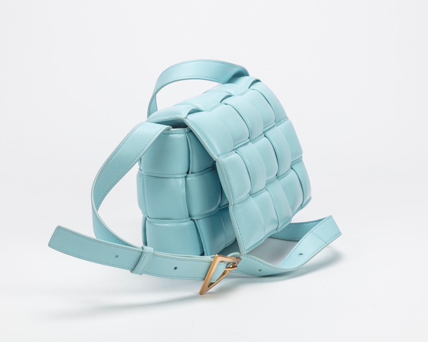 in pelle intrecciata color azzurro intrecciata, dettagli in metallo dorato, cm 25, con sacchetto e scatola (lievissimi segni d'uso)in pelle intrecciata color azzurro intrecciata, dettagli in metallo dorato, cm 25, con sacchetto e scatola (lievissimi segni d'uso)