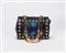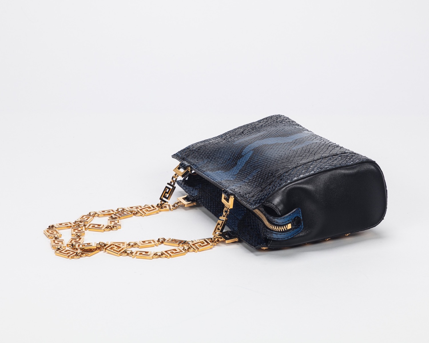 in pelle color nero e blu, profili con borchie, doppi manici a catena in metallo dorato, cm 24, con sacchetto in pelle color nero e blu, profili con borchie, doppi manici a catena in metallo dorato, cm 24, con sacchetto