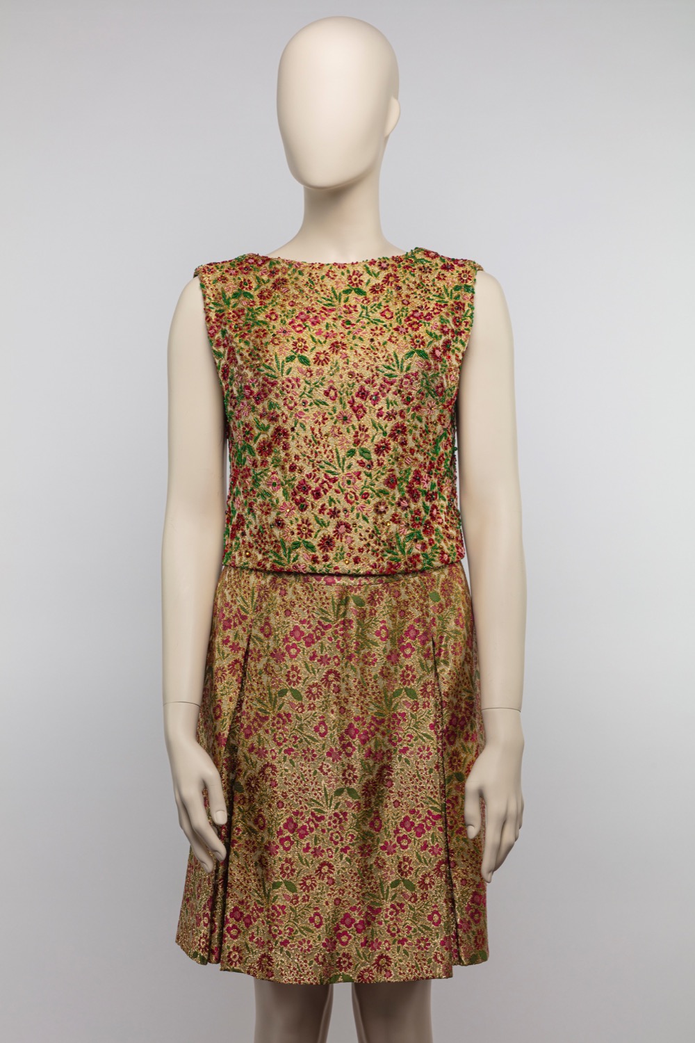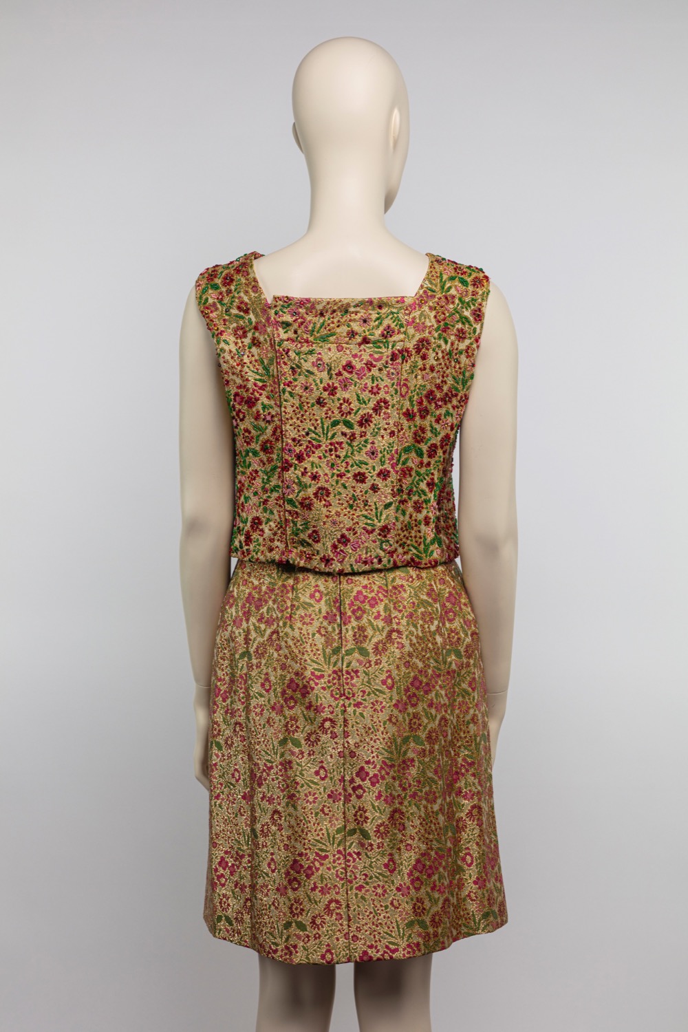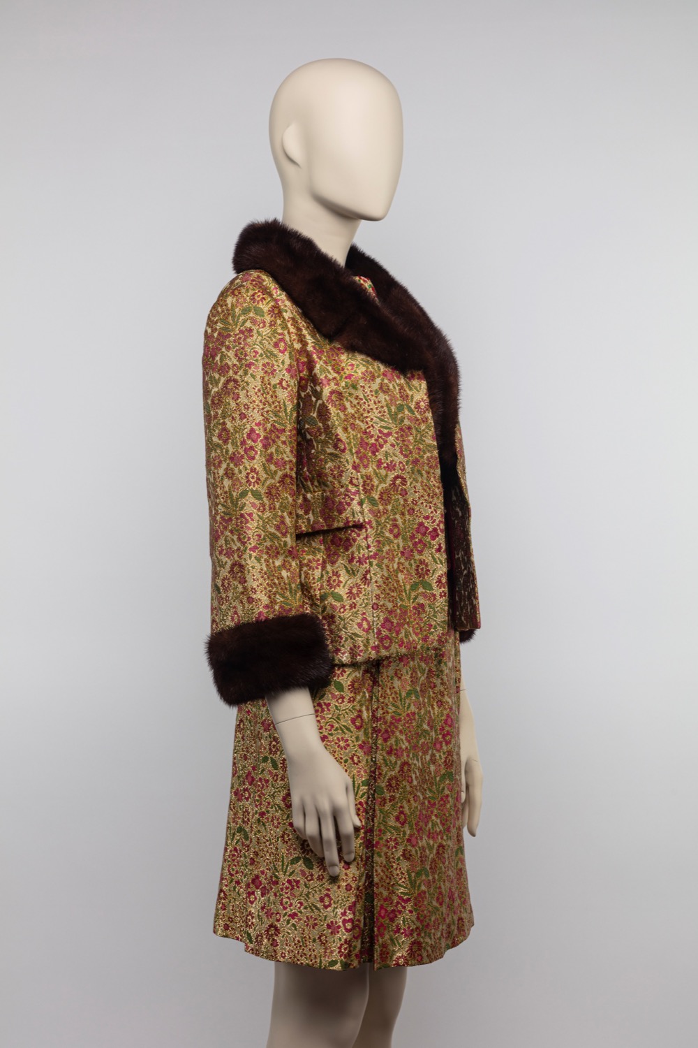 da sera composto da giacchino, top smanicato e gonna in tessuto jacquard a motivo floreale nelle tonalità del verde, rosso, rosa e oro su fondo color beige. Top ricamato con strass e perline di vetro, bordure in pelliccia. Taglia non indicata, etichetta mancante solo sulla gonna (segni d'uso)da sera composto da giacchino, top smanicato e gonna in tessuto jacquard a motivo floreale nelle tonalità del verde, rosso, rosa e oro su fondo color beige. Top ricamato con strass e perline di vetro, bordure in pelliccia. Taglia non indicata, etichetta mancante solo sulla gonna (segni d'uso)