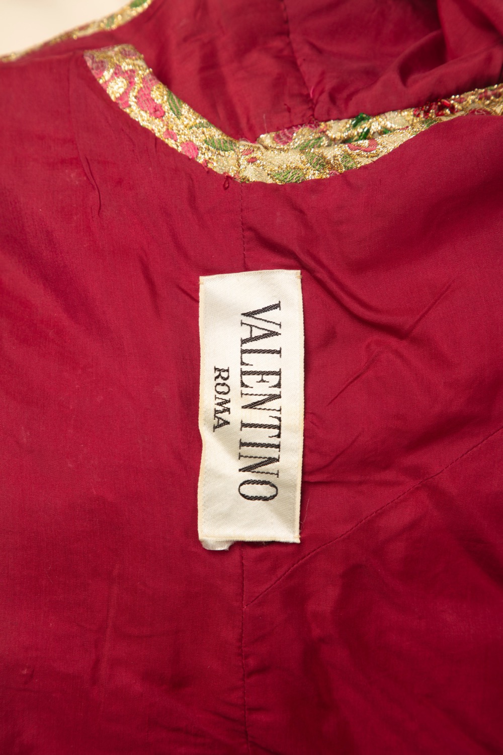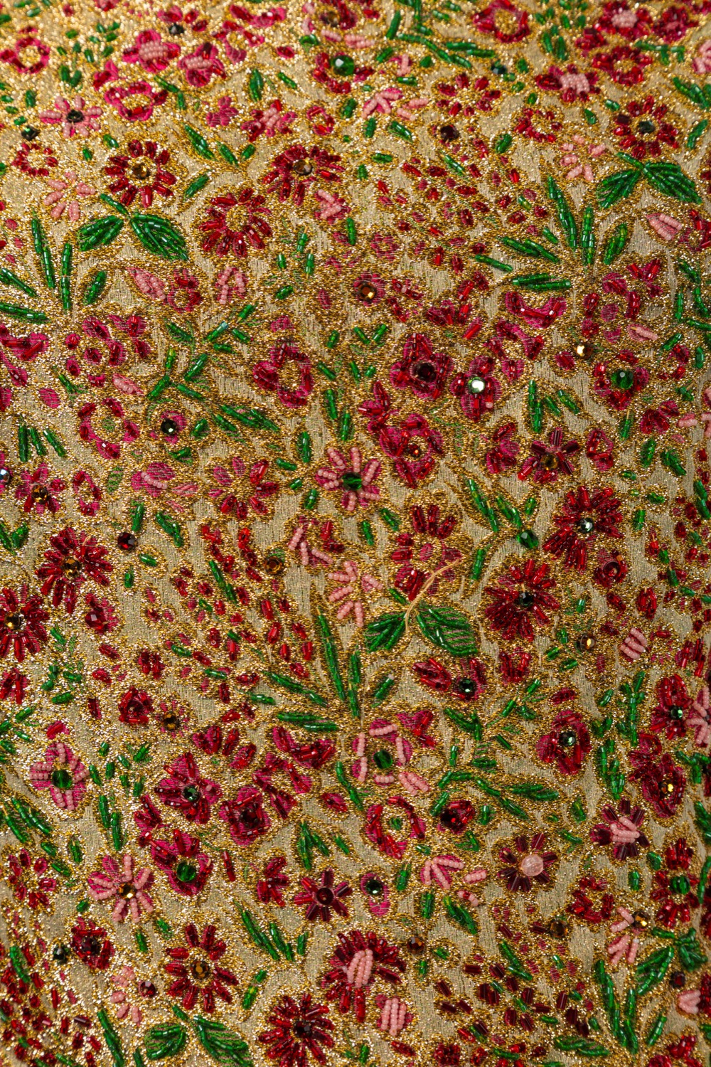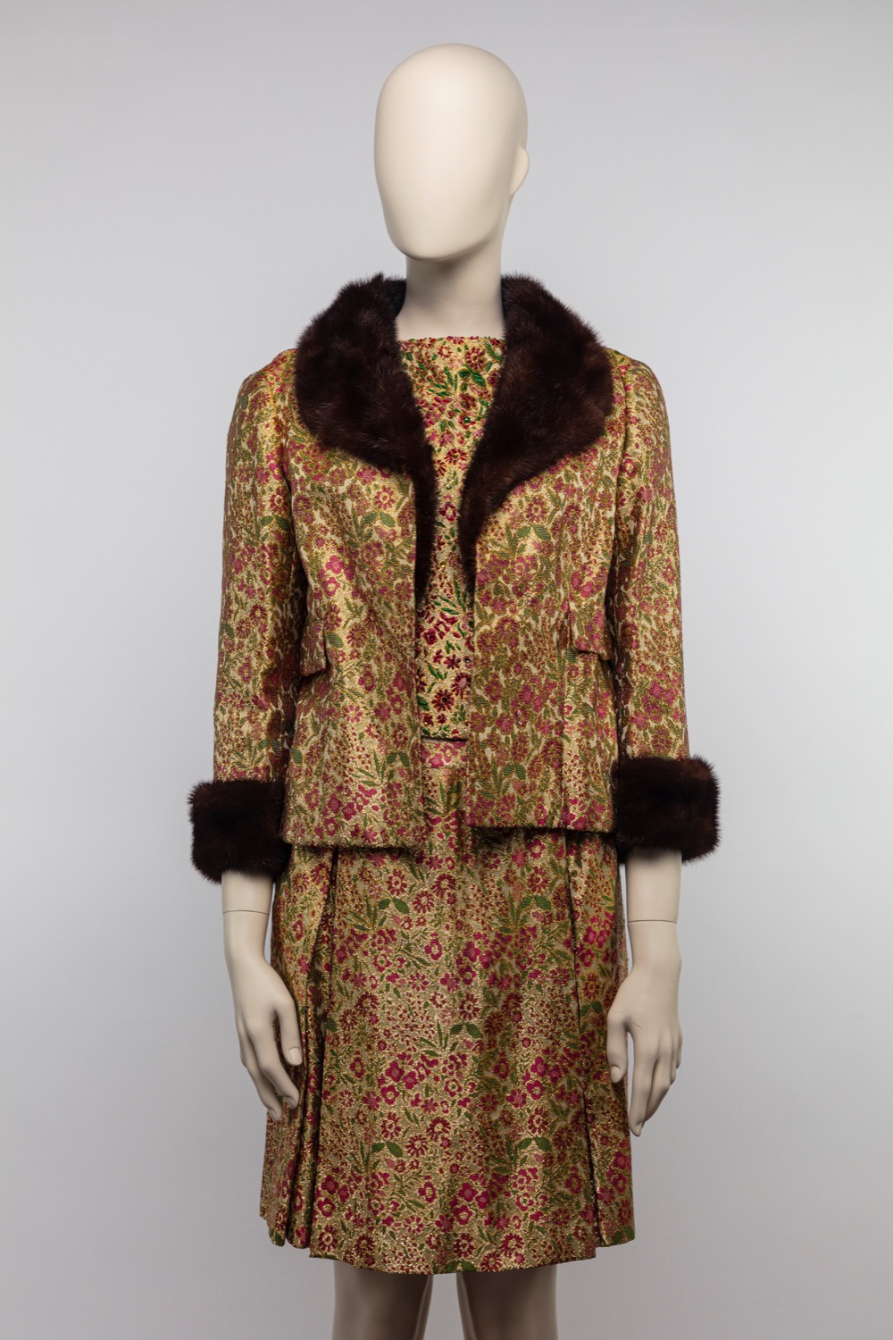 da sera composto da giacchino, top smanicato e gonna in tessuto jacquard a motivo floreale nelle tonalità del verde, rosso, rosa e oro su fondo color beige. Top ricamato con strass e perline di vetro, bordure in pelliccia. Taglia non indicata, etichetta mancante solo sulla gonna (segni d'uso)da sera composto da giacchino, top smanicato e gonna in tessuto jacquard a motivo floreale nelle tonalità del verde, rosso, rosa e oro su fondo color beige. Top ricamato con strass e perline di vetro, bordure in pelliccia. Taglia non indicata, etichetta mancante solo sulla gonna (segni d'uso)