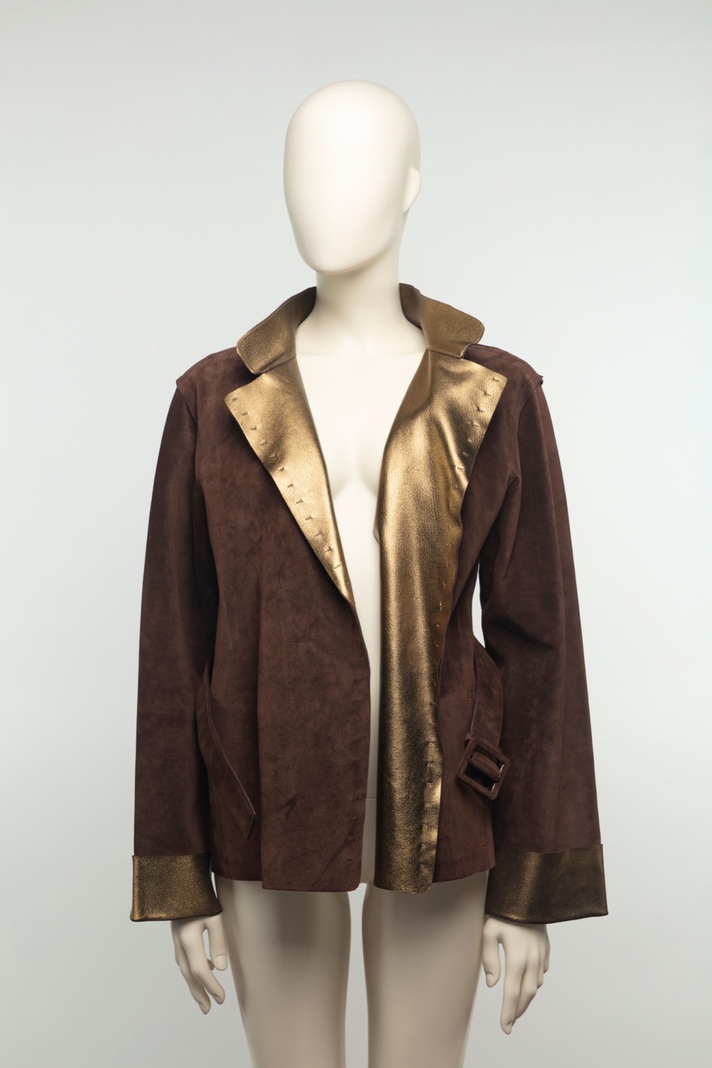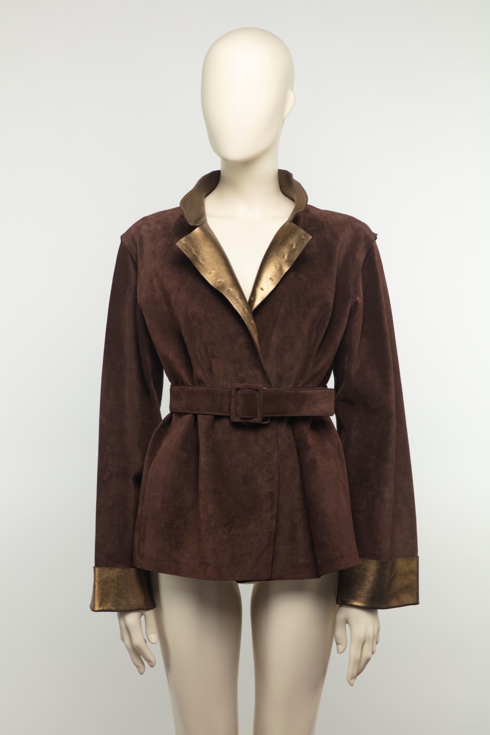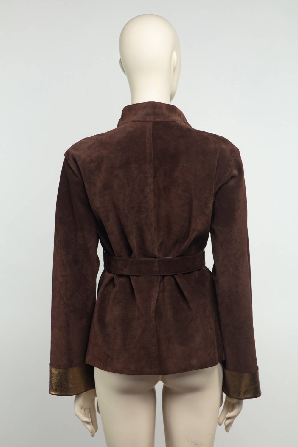 in camoscio color tabacco, interno in pelle color bronzo, con tasche e cintura, taglia 38 francese (lievissimi segni d'uso)in camoscio color tabacco, interno in pelle color bronzo, con tasche e cintura, taglia 38 francese (lievissimi segni d'uso)