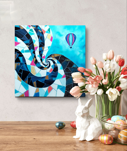 Questo quadro è stato ispirato dalle spirali di Gaudì di ritorno da un viaggio a Barcellona e dalla sensazione di leggerezza vissuta in quel momento tramite la simbologia della mongolfiera. Patricia è stata la prima a capire il messaggio del quadro "aggiudicandosi" il titolo del dipinto. Non necessita di cornice perchè i bordi della tela sono colorati.