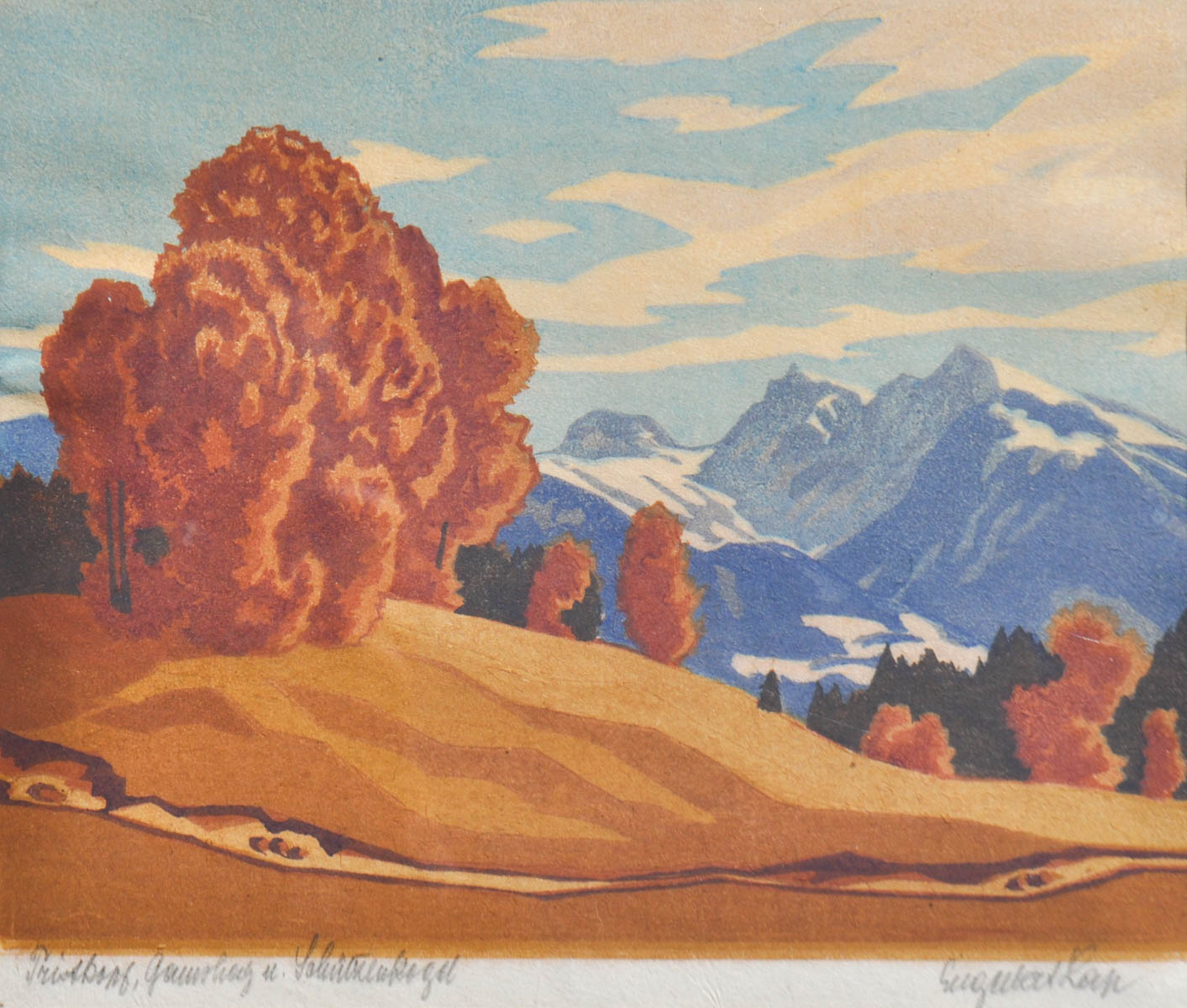 Engelbert Lap (Graz 1886 - Innsbruck 1970) Gamsberg e Schützenkogel;Xilografia a colori, 19 x 22 cm, in cornice