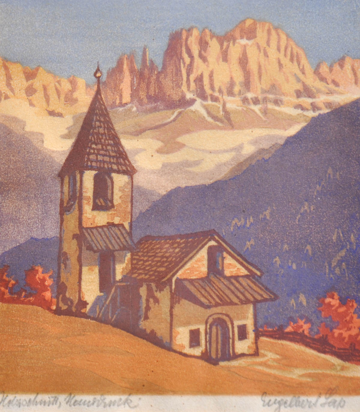 Engelbert Lap (Graz 1886 - Innsbruck 1970) San Cipriano con Catinaccio;Xilografia a colori, 16 x 16 cm, in cornice