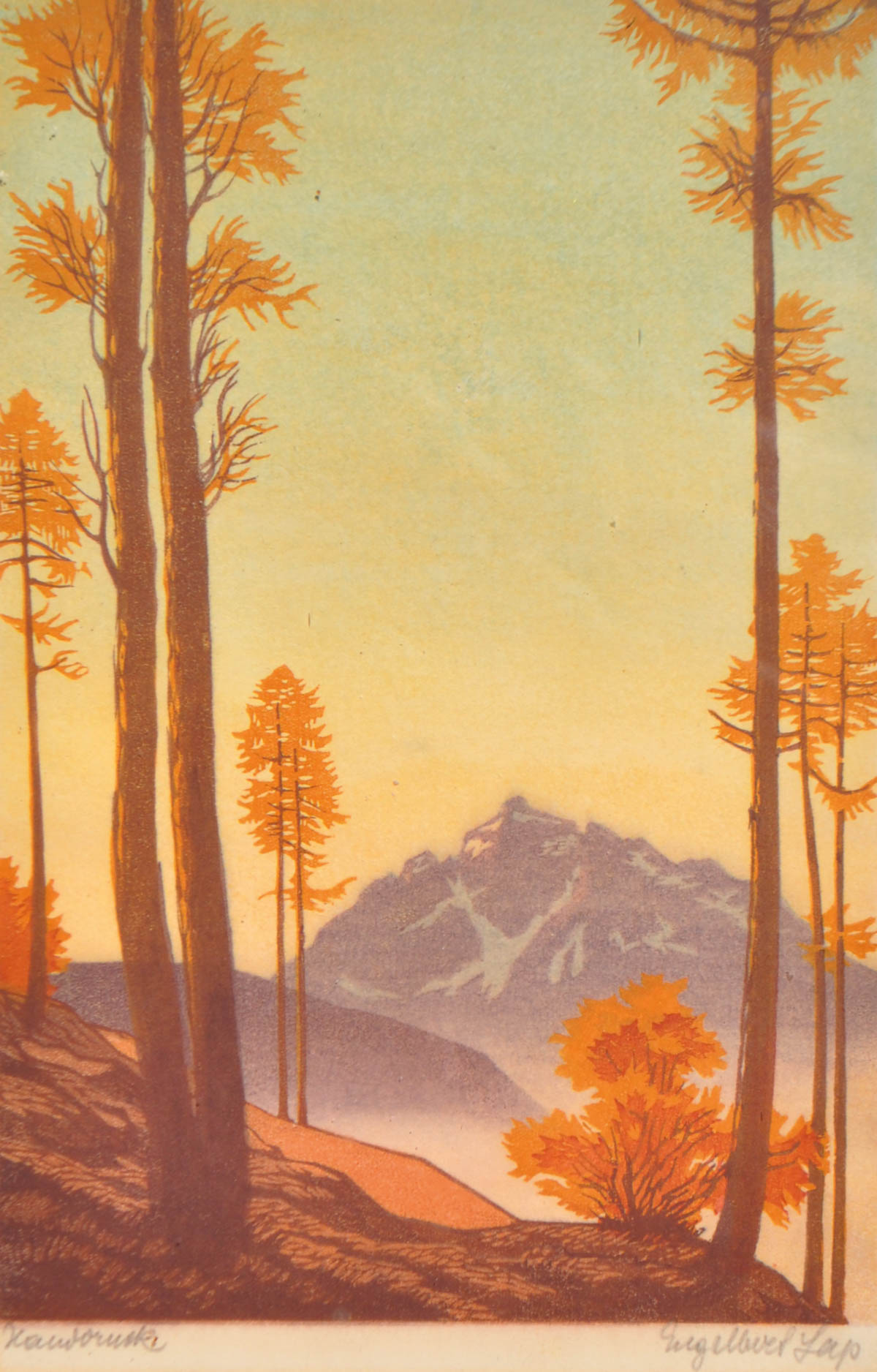 Englbert Lap (Graz 1886 - Innsbruck 1970) Larici con vista sulla Serles;...