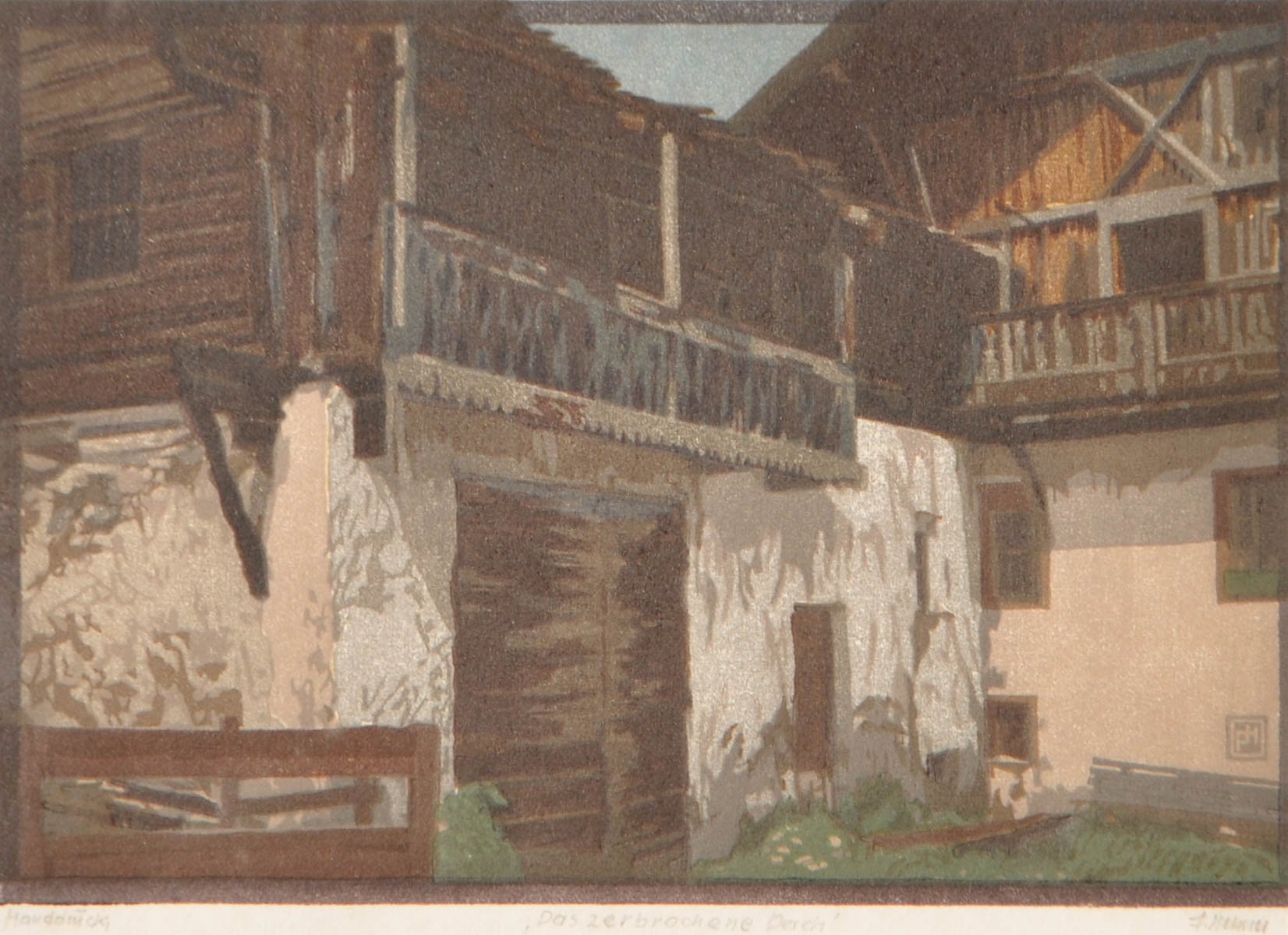Franz Helmer (Lienz 1909 - Innsbruck 1990) Il tetto rotto;Xilografia a colori, 17,5 x 25 cm (immagine), in cornice