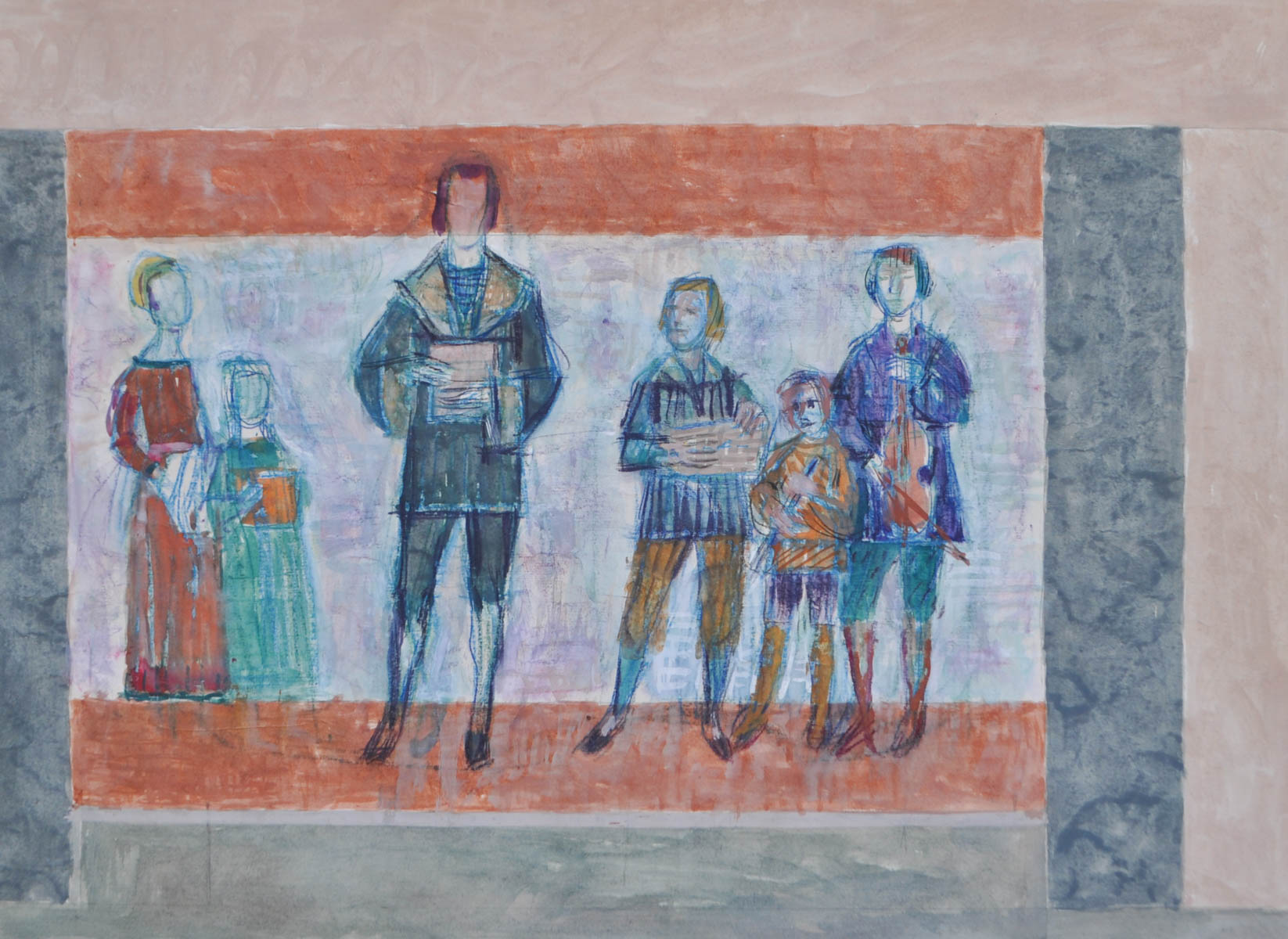Hans Prünster (Riffian/Rifiano 1907 - Bozen/Bolzano 2005) Bozzetto per affresco "Mittelschule Gries/Bozen", 1967;Tecnica mista su carta, 77,5 x 107,5 cm, danni dovuti all'età