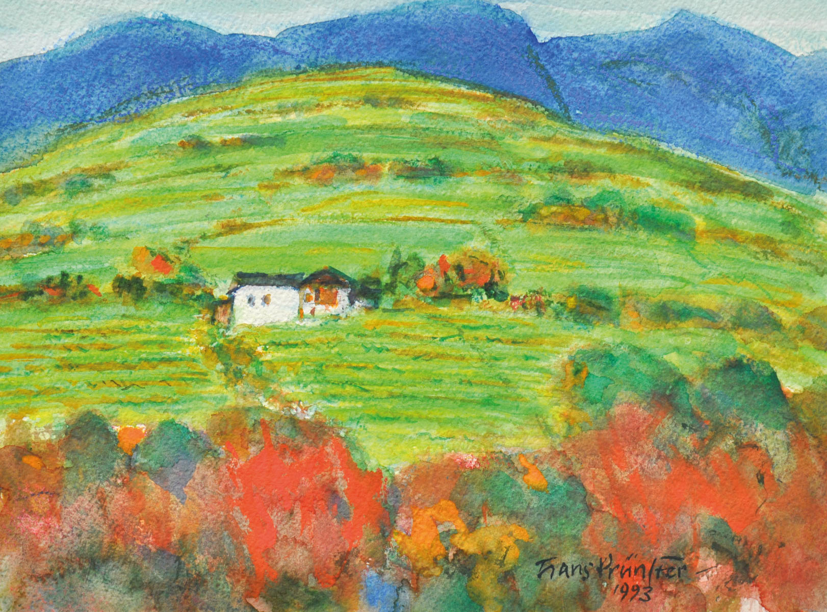 Hans Prünster (Riffian/Rifiano 1907 - Bozen/Bolzano 2005) Maso in collina, 1993;Tempera su carta, 32,5 x 40,8 cm