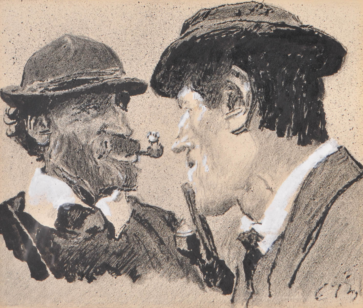 Eduard Thöny (Brixen/Bressanone 1866 - Holzhausen am Ammersee 1950) Due contadini che fumano la pipa, 1907;Tecnica mista, in parte spruzzata, su carta, 21,5 x 25,5 cm (entro il passepartout),