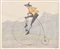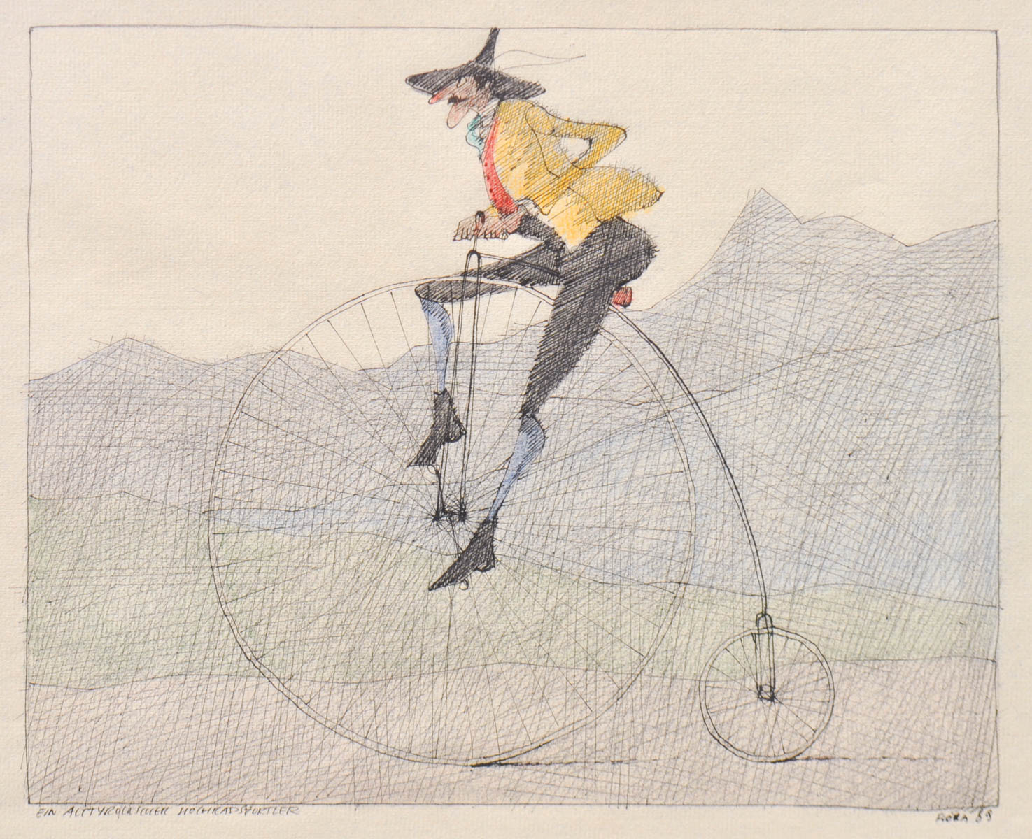 Paul Flora (Glurns/Glorenza 1922 - Innsbruck 2003) Ciclista a ruota alta tirolese, 1989;China e matite colorate, 21,7 x 26,7 cm (entro il