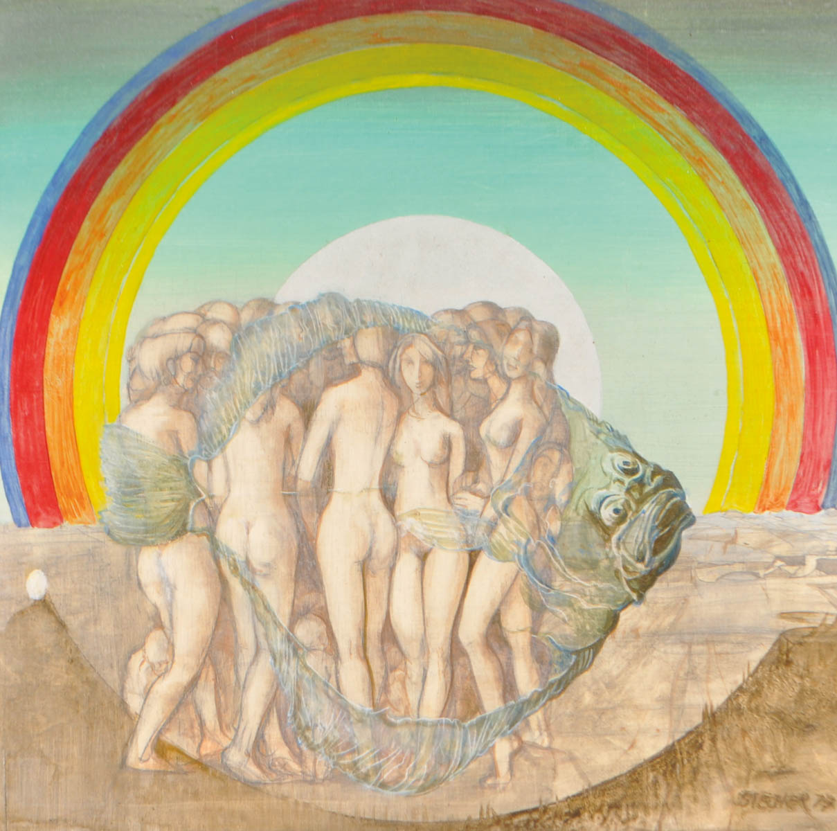 Luis Stefan Stecher (Laas/Lasa 1937) "Die Lobby des Feuers" ("Der Butt" di Günther Grass), 1977;Olio su tavola, 36 x 37 cm, in cornice