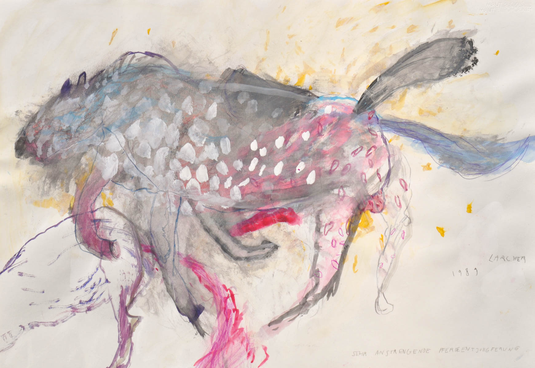Peter Adrian Larcher (Bregenz 1955 - Innsbruck 2024) Sverginamento di cavallo molto faticoso, 1989;Tecnica mista su carta, 31 x 44,6 cm