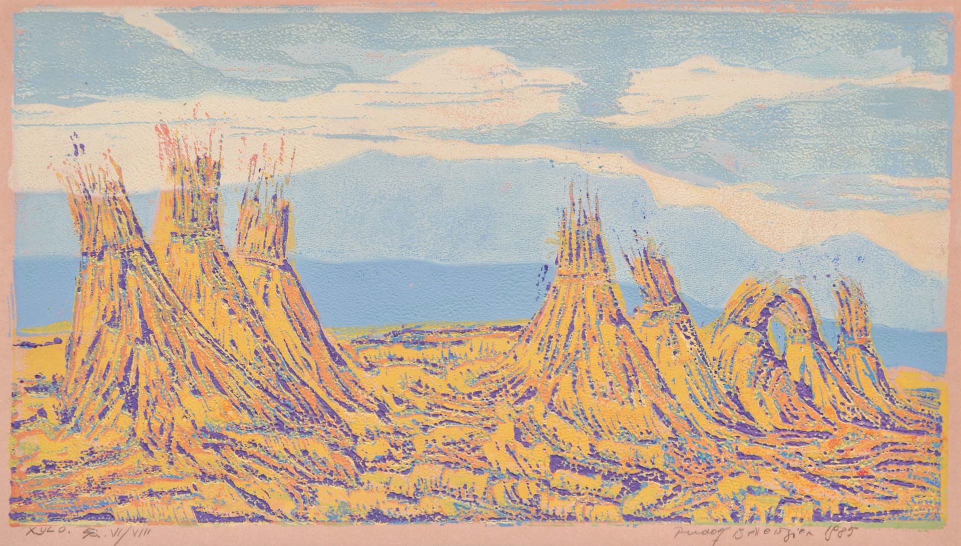 Rudolf Bellenzier (Tötschling, Brixen 1922 - Meran/Merano 1990) "Kornmandeln" in Alto Adige, 1985;Xilolitografia, 30,5 x 53 cm (entro il passepartout)