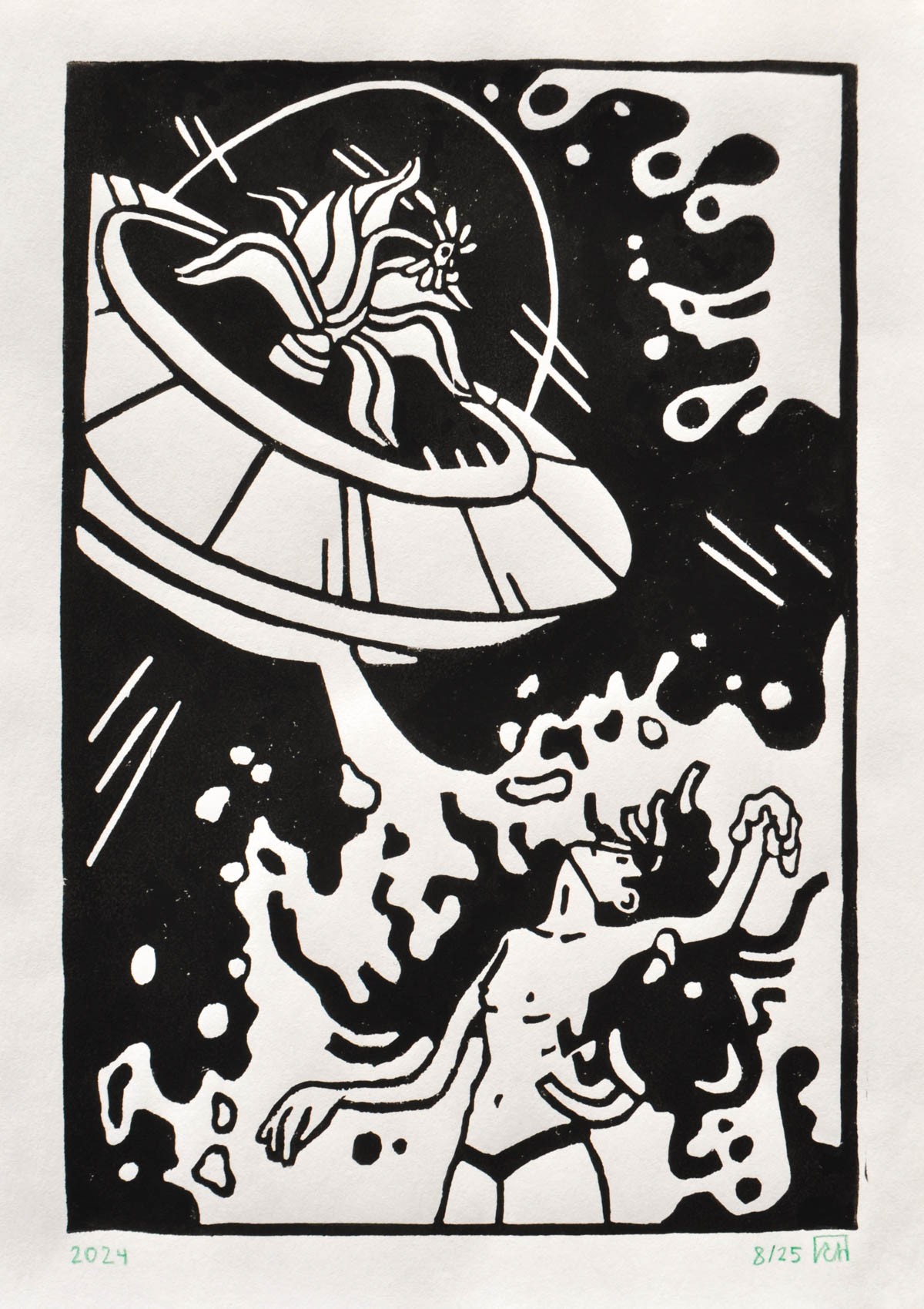 Lisa Achammer (Innsbruck 1999 - lebt in Wien/vive a Vienna) Raccolta, 2024;Linoleografia, 25 x 17,2 cm (lastra)