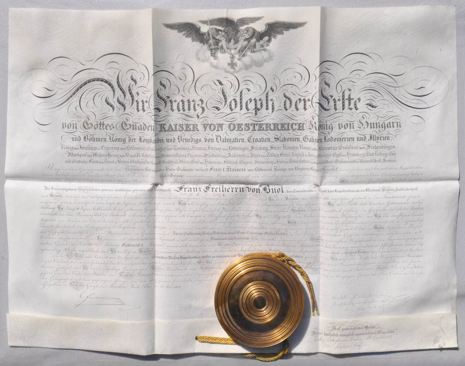 Anonym/anonimo Francesco Giuseppe I - Gran Certificato..., 1857;di Croce di Commendatore dell'Ordine di Leopoldo per il Consigliere Imperiale Franz Freiherr von Buol, Vienna, 22 maggio 1854