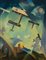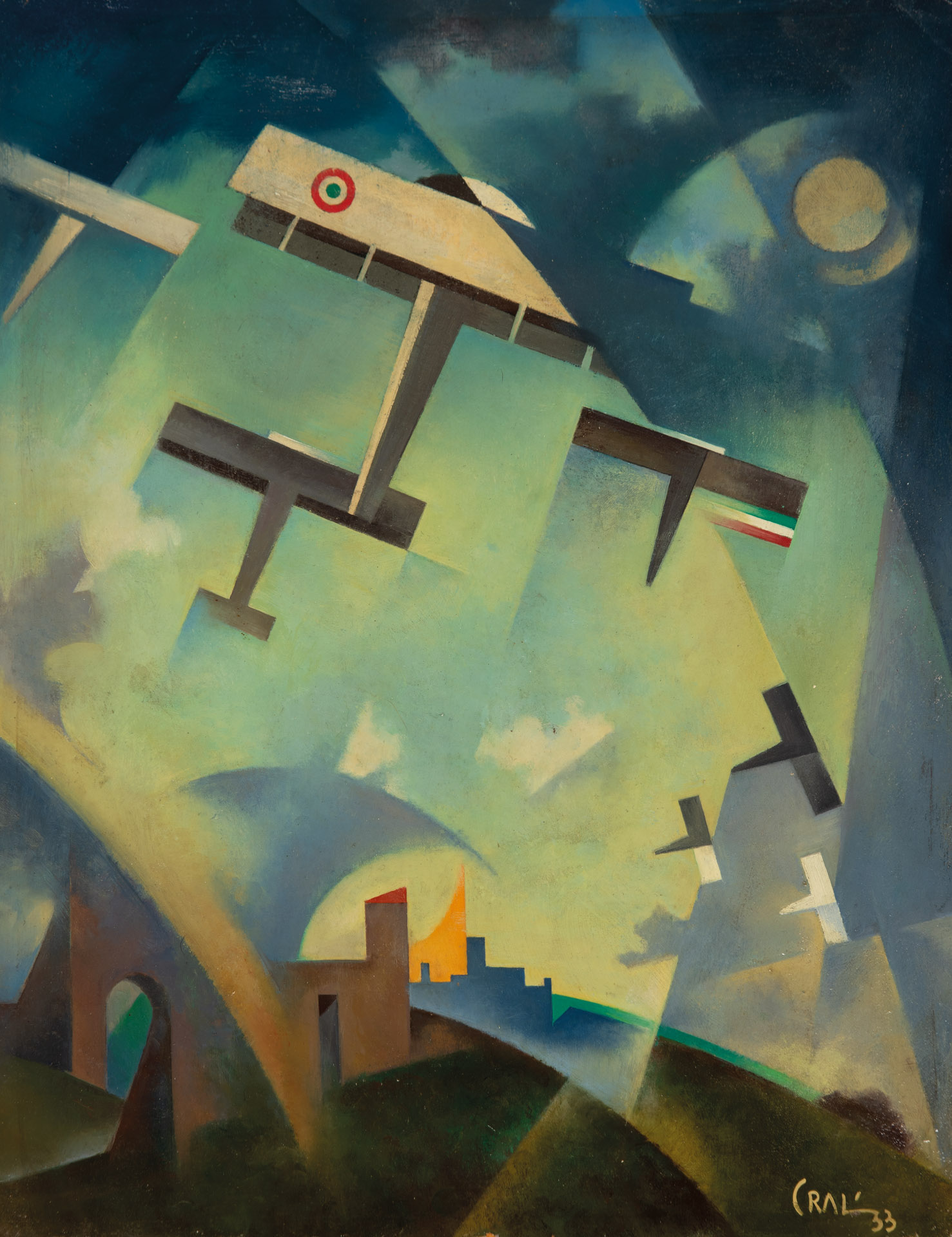 Tullio Crali (Igalo, 1910 - Mailand/Milano 2000) Aerei tricolori al tramonto sulla periferia, 1933;Olio su cartone, 45,5 x 35,5 cm
